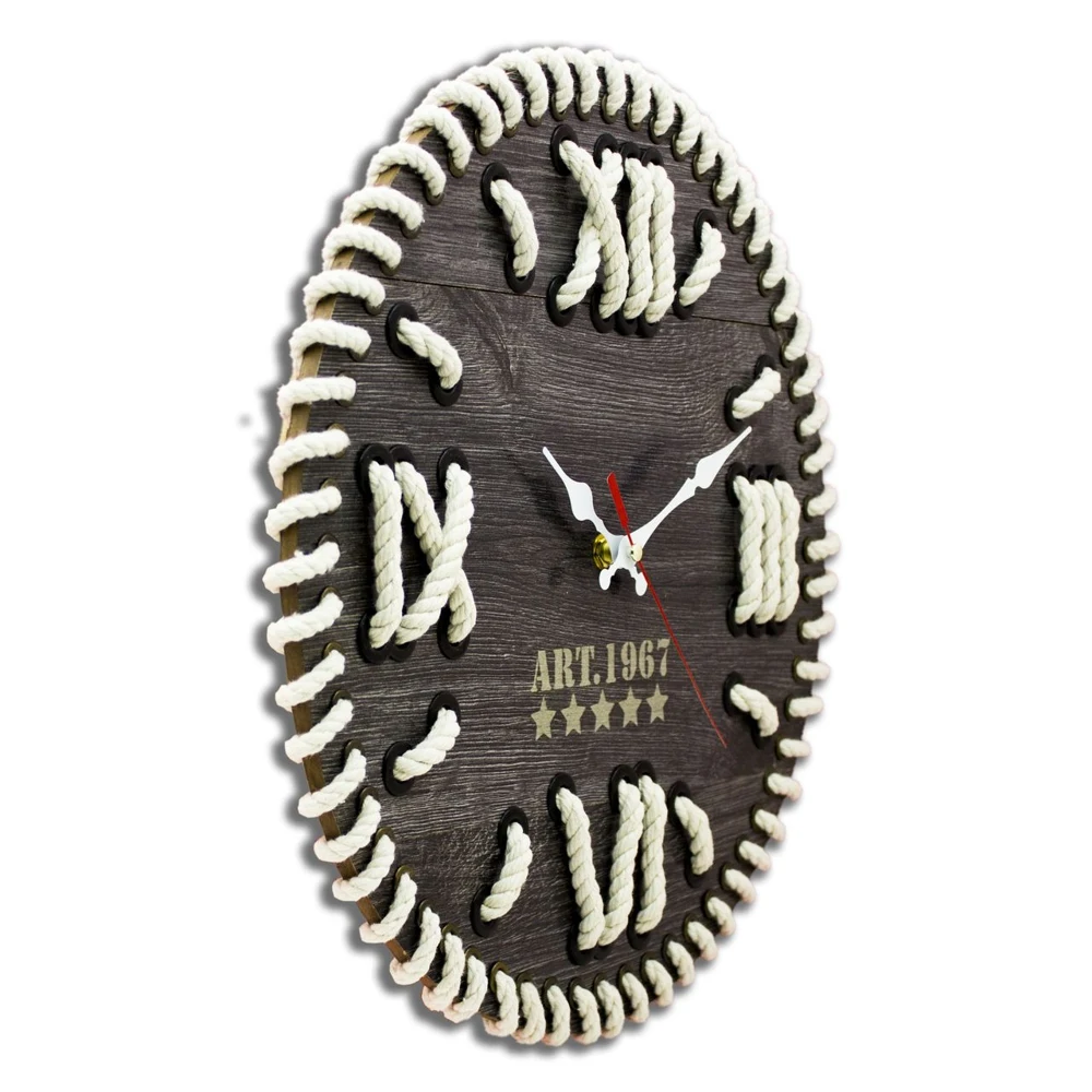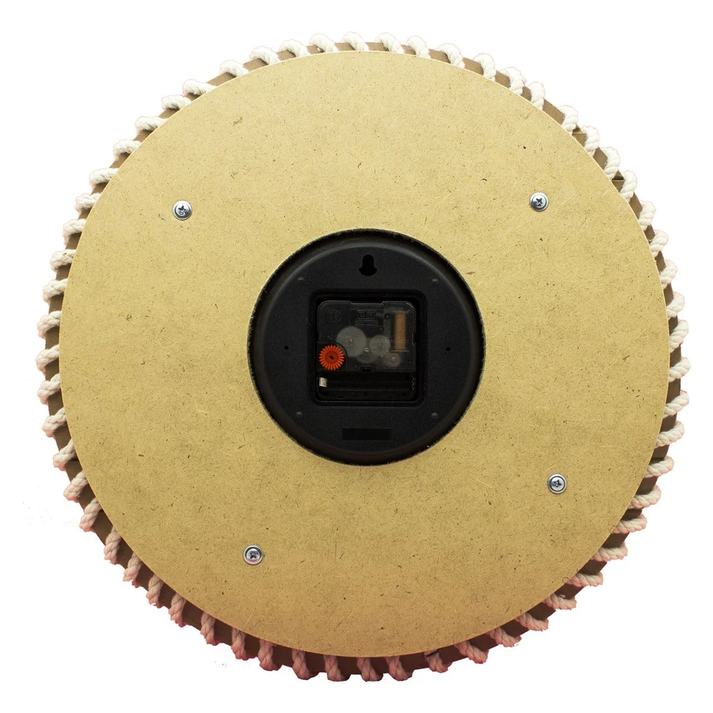 Часы выполнены из ламинированного МДФ с использованием натуральной веревки и металлических люверсов. Кварцевый механизм часов изготовлен компанией ETA (Чехия). Ход часов плавный и практически бессшумный. Наличие секундной стрелки имеется. Отверстие для крепления часов к стене встроенно в конструкцию часов.