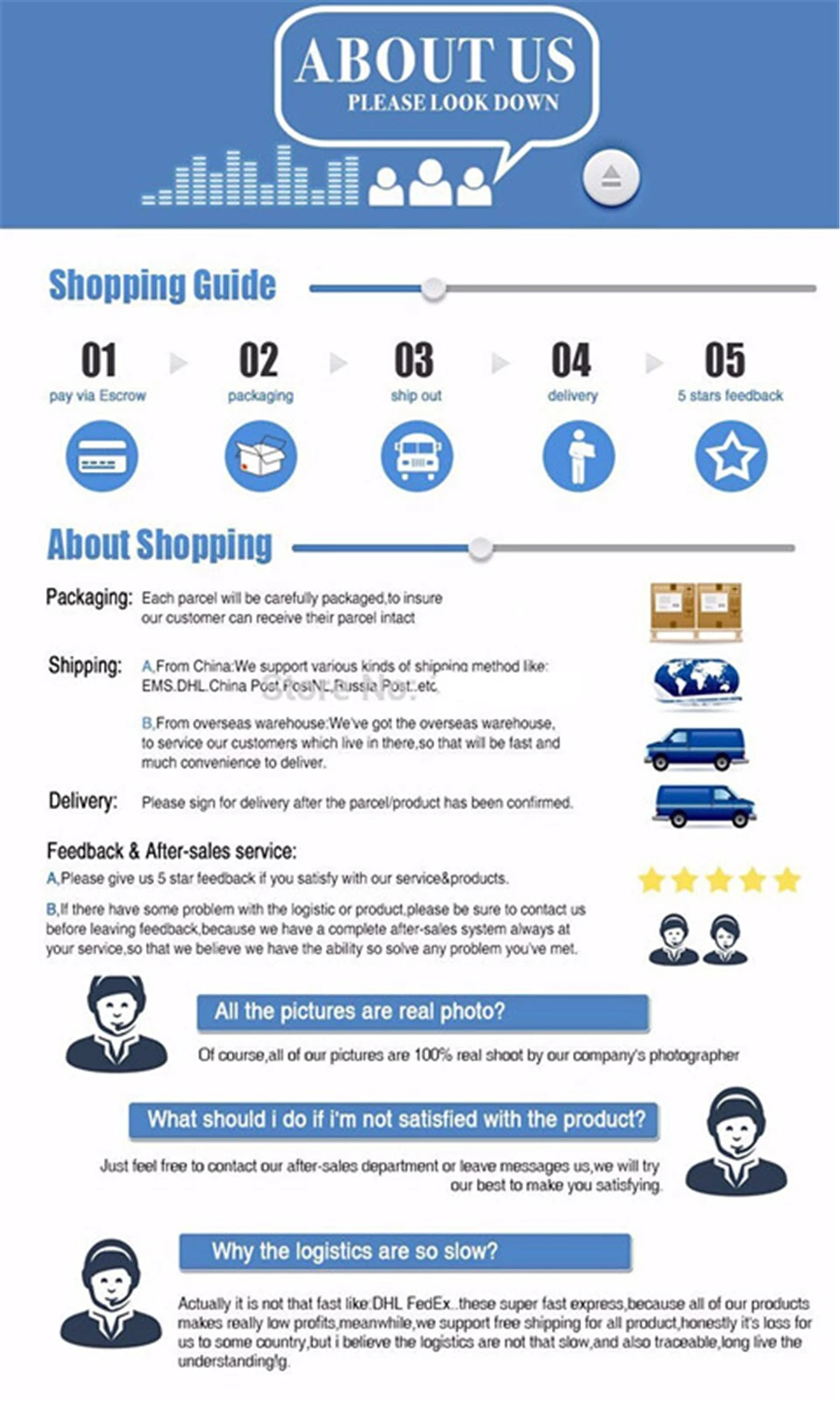 Примечания к покупке: Размер: Пожалуйста, проверьте нашу таблицу размеров и как определить размер перед покупкой. Обратите внимание, что в таблице размеров может быть погрешность в 1-3 см из-за метода измерения. Если вы не знаете, какой размер вы хотите выбрать, пожалуйста, свяжитесь с нами, и мы вам поможем. Цвет: фактический цвет товара может немного отличаться от изображения, отображаемого на веб-сайте, что вызвано многими факторами, такими как яркость и яркость дисплея. Меры предосторожности: 1. Пожалуйста, при заполнении информации о покупателе оставьте правильный номер телефона и правильный адрес. 2. Это займет несколько дней, чтобы упаковать товар, исправить его и отправить его в почтовое отделение (мы сделаем это как можно скорее), тогда мы будем заполнять номер отслеживания, которые вы можете найти в деталях заказа. 3. Наши варианты доставки только для справки, мы можем выбрать более быстрый способ доставки для вашего заказа, пожалуйста, обратите внимание. 4. Если у вас есть какие-либо особые требования, пожалуйста, свяжитесь с нами. Из-за разницы во времени между нами, мы ответим в течение 24 часов. Проблема транспортировки: Если вы не получили товар до истечения срока защиты, пожалуйста, свяжитесь с нами, мы продлим его, чтобы вы могли получить товар, И мы свяжемся с курьерской компанией, чтобы помочь вам найти вашу посылка. Если посылка утеряна, мы отправим ее повторно или вернем вам деньги. Вопросы качества: Если вы получили товар с проблемами качества, пожалуйста, свяжитесь с нами и отправьте нам фотографию товара. После проверки фотографий, мы дадим вам частичный возврат в качестве компенсации, если есть проблемы с качеством, или вы можете вернуть и получить полный возврат. (Возвращенная стоимость доставки оплачивается вами.) Проблема аксессуаров: Если вы получили недостающий товар, пожалуйста, свяжитесь с нами, и мы отправим вам недостающую часть. Обмен: Мы предоставляем услуги обмена, если вам не нравится цвет или размер, не подходит, пожалуйста, свяжитесь с нами, мы предоставим вам наш адрес, вы можете отправить его обратно, Я отправлю вам другой цвет или размер после получения. И сообщите вам новый номер отслеживания. Стоимость обратной доставки оплачивается вами. Отзывы: Ваши отзывы очень важны для нас. Если вы удовлетворены товаром, пожалуйста, оставьте 5 звезд положительные отзывы. Если вы не удовлетворены своим урожаем, пожалуйста, сначала свяжитесь с нами, мы можем решить эту проблему и сделать вас удовлетворенными. Спасибо вам