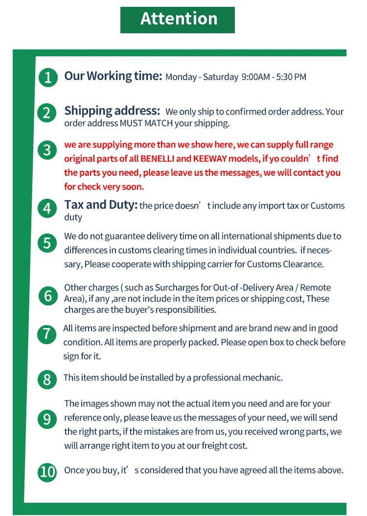 Уважаемые покупатели, Из-за того, что мы не можем поместить все товары в линию, мы выбираем размещение наших каталожных страниц в линию, пожалуйста, проверьте необходимые вам товары и сообщите нам номер товара, который вам нужен, тогда мы предложим вам цену и доставку, вы можете оплатить сумму нашим подтверждением, Затем мы организуем вам правильные детали, прежде чем мы отправим детали, мы отправим вам фотографии для подтверждения. Мы очень сильные и профессиональные в этом бизнесе, пожалуйста, доверьтесь нам. Приходите к нам, вы получите сюрпризы! С наилучшими пожеланиями Afawey магазин