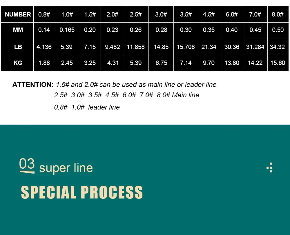 Основные параметры:Номер лески 0,8 #: 0,14 мм/4.136LB/1,88 кгНомер лески 1,0 #: 0,165 мм/5,39 фунтов/2,45 кгНомер лески 1,5 #: 0,20mm / 7.15LB/3,25 кгНомер лески 2,0 #: 0,23 мм/9.482LB/4,31 кгНомер лески 2,5 #: 0,26 мм/11,858lb/5,39 кгНомер лески 3,0 #: 0,28 мм/14,85 фунтов/6,75 кгНомер лески 3,5 #: 0,30 мм/15.708LB/7,14 кгНомер лески 4,5 #: 0,35mm / 21.34LB/9,7 кгНомер линии 6,0 #: 0,40 мм/30,36 фунтов/13,80 кгНомер лески 7,0 #: 0,45 мм/31,284lb/14,22 кгНомер лески 8,0 #: 0,50 мм/34,32 фунта/15,60 кг