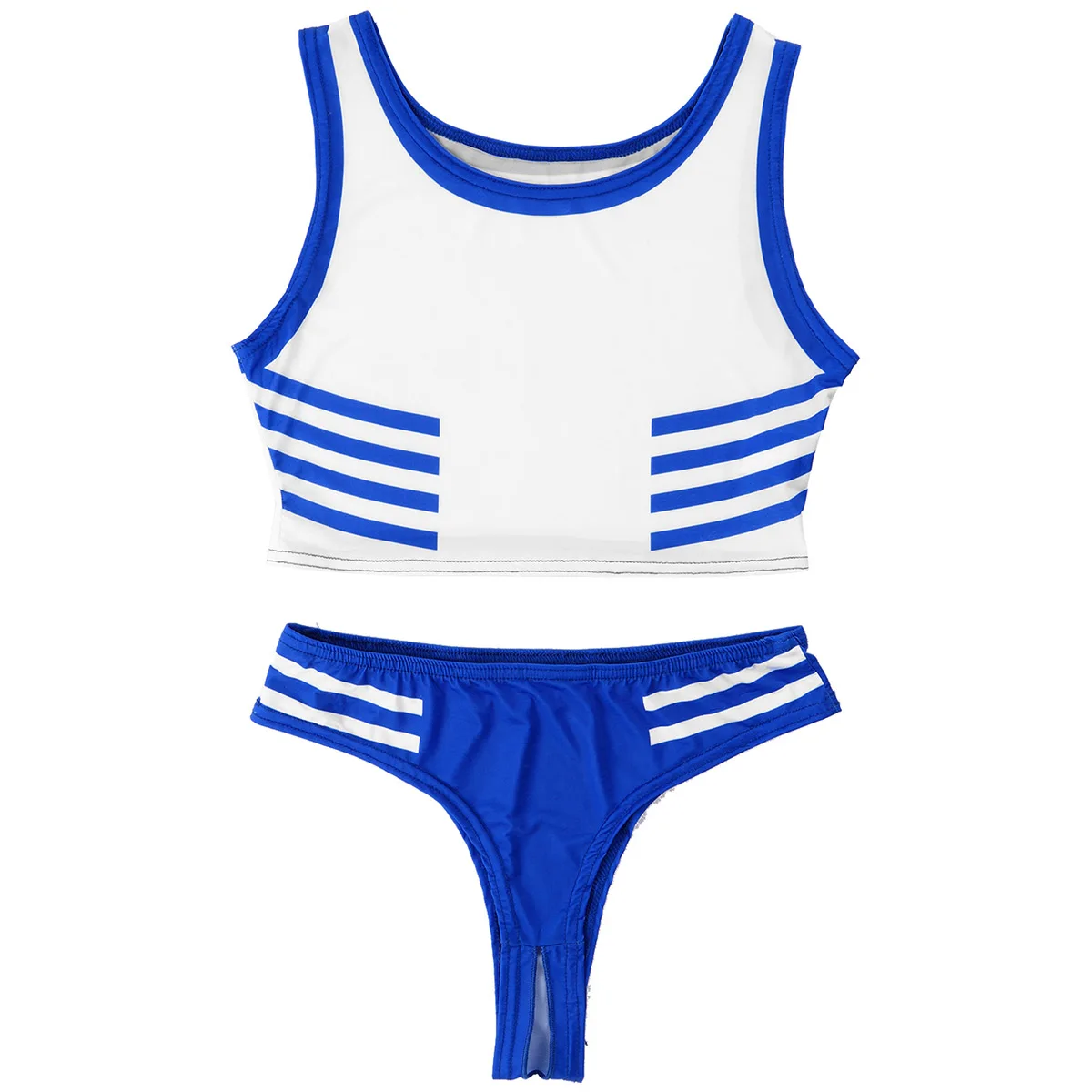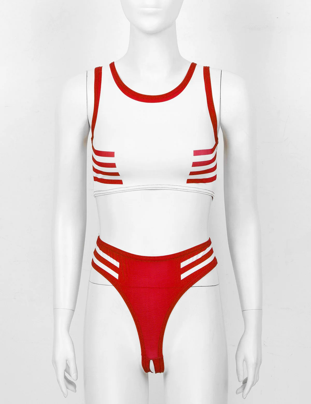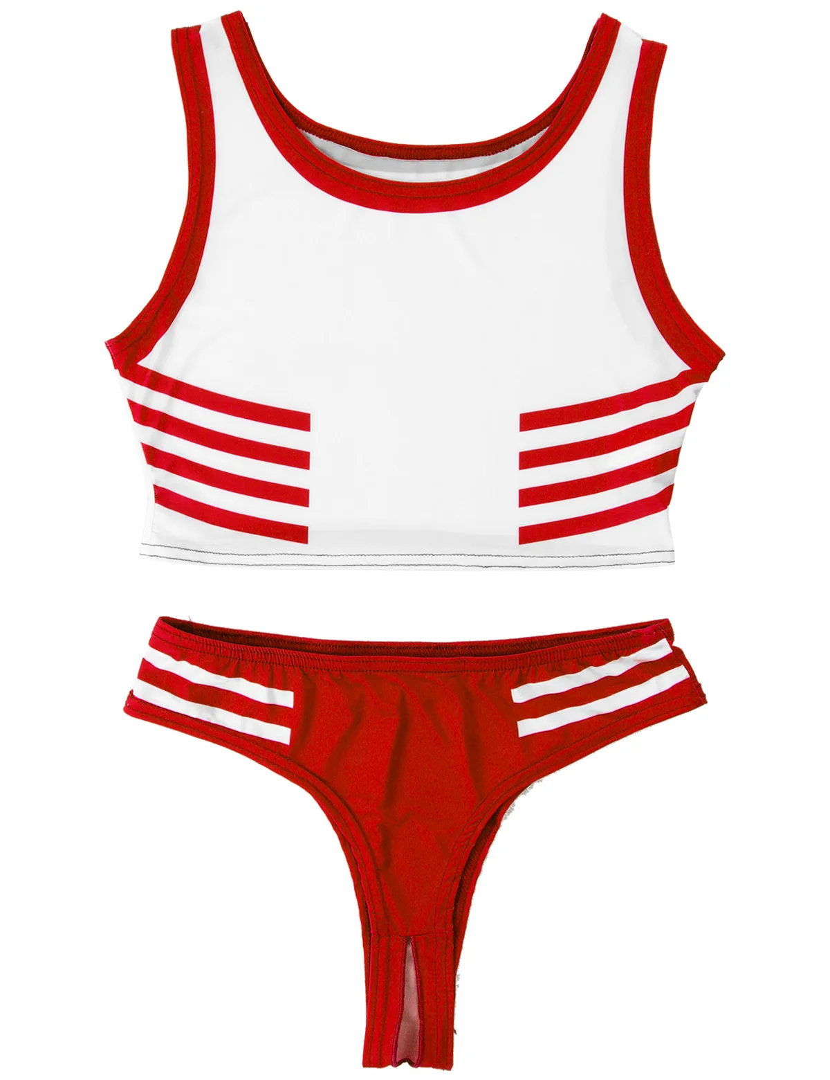 Классический укороченный топ в полоску по бокам, с круглым вырезом и без рукавов, сочетается с эластичными мини-трусами с высокой талией, без выреза.