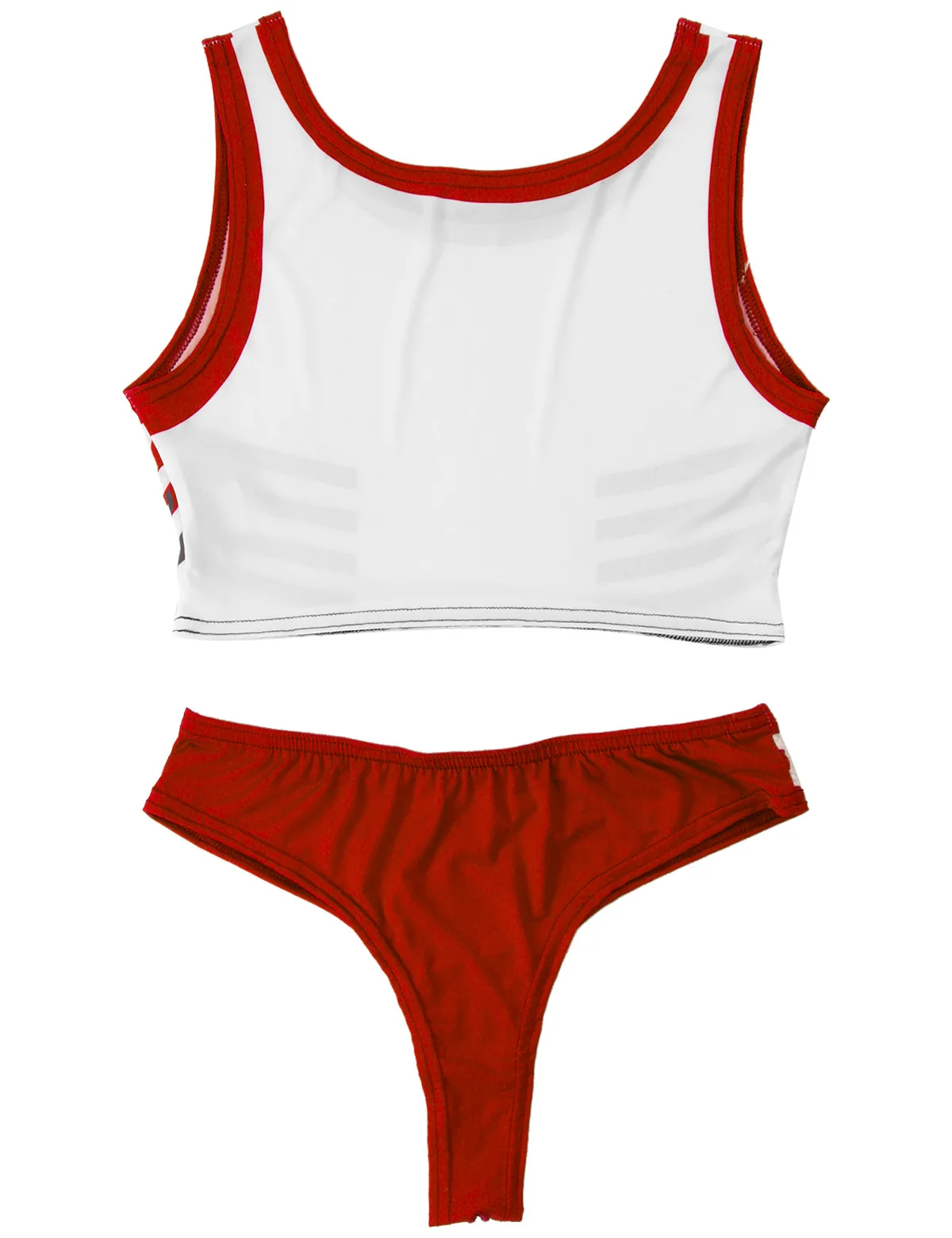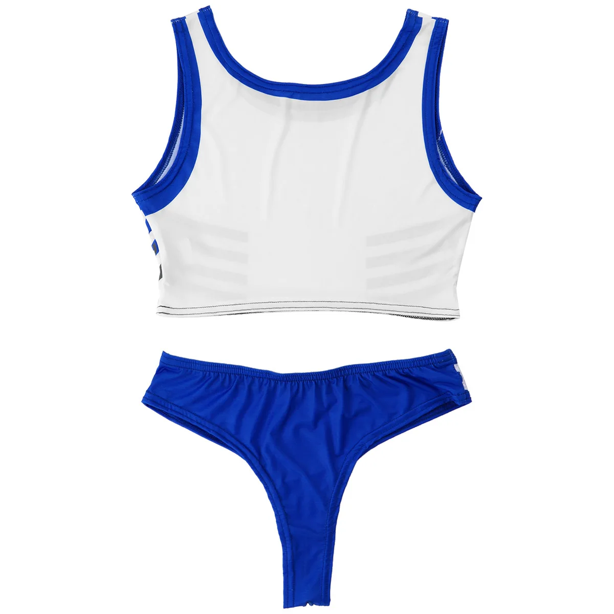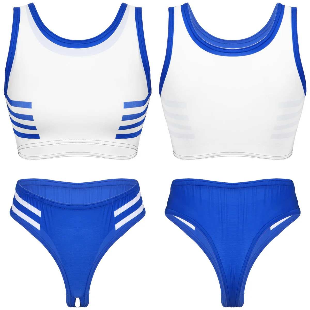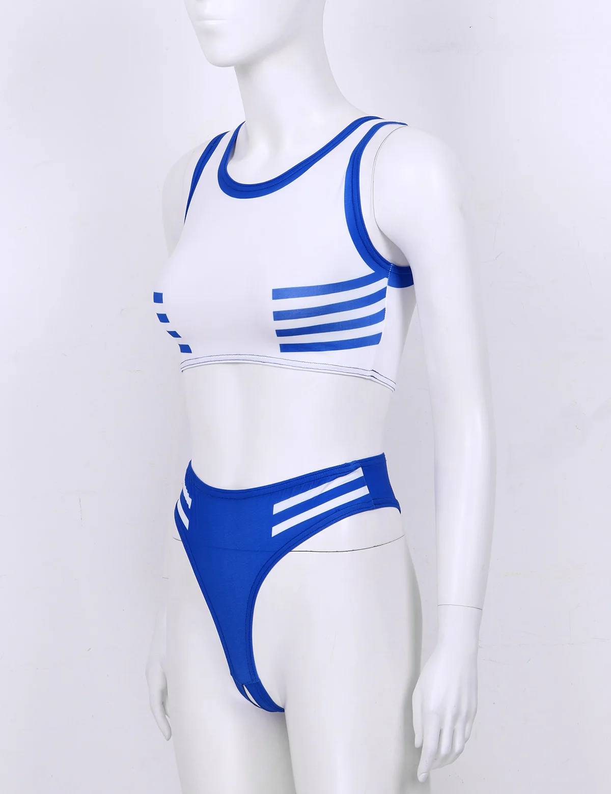 Классический укороченный топ в полоску по бокам, с круглым вырезом и без рукавов, сочетается с эластичными мини-трусами с высокой талией, без выреза.