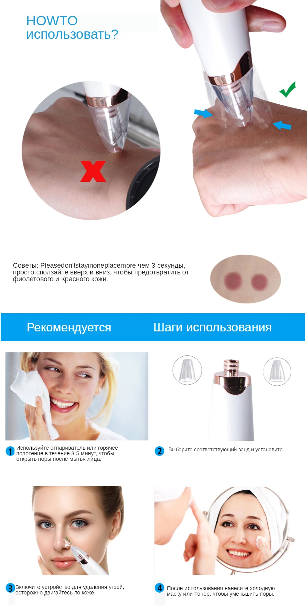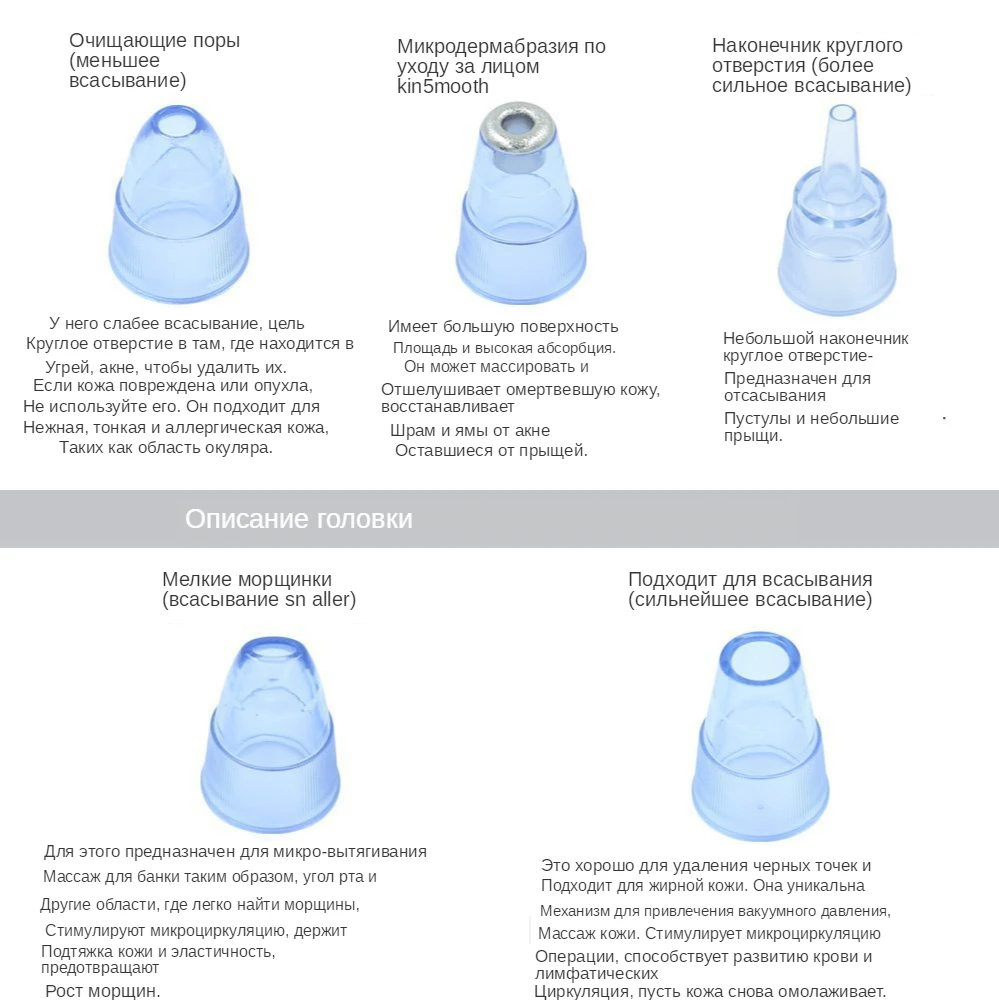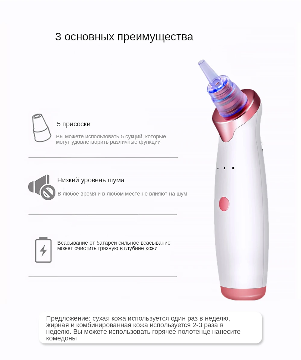 ✔Пожалуйста, не используйте всасывания на одной и той же области все время, это сделает кожу отекают. Если кожа набухает, немедленно прекратите использование.✔Перед использованием продукта, используйте Хот дог пароход или горячим полотенцем или для удаления угрей гель/крем на вашей коже в течение 5 минут, чтобы полностью открыты ваши поры во-первых, чтобы обеспечить самое лучшее представление продукта. Как использовать? Шаг 1: очистите лицо, используйте с лосьоном для удаления черных точек или аппарат для паровой бани лица, чтобы открыть поры. Шаг 2: в соответствии с вашими требованиями, вы можете выбрать пять всасывание. Начните с самым низким минимальным объемом. Шаг 3: движение Угри очищающее средство туда и обратно вокруг поры с постоянной скоростью, медленно двигаться, не оставаться в одном месте слишком долго, чтобы избежать травм, И не нажать вряд ли или Потяните в вертикальном положении. Шаг 4: умойтесь пожалуйста, используйте полотенце для льда или холодной воды и не может иметь складок жидкости, чтобы восстановить обработанной поры.