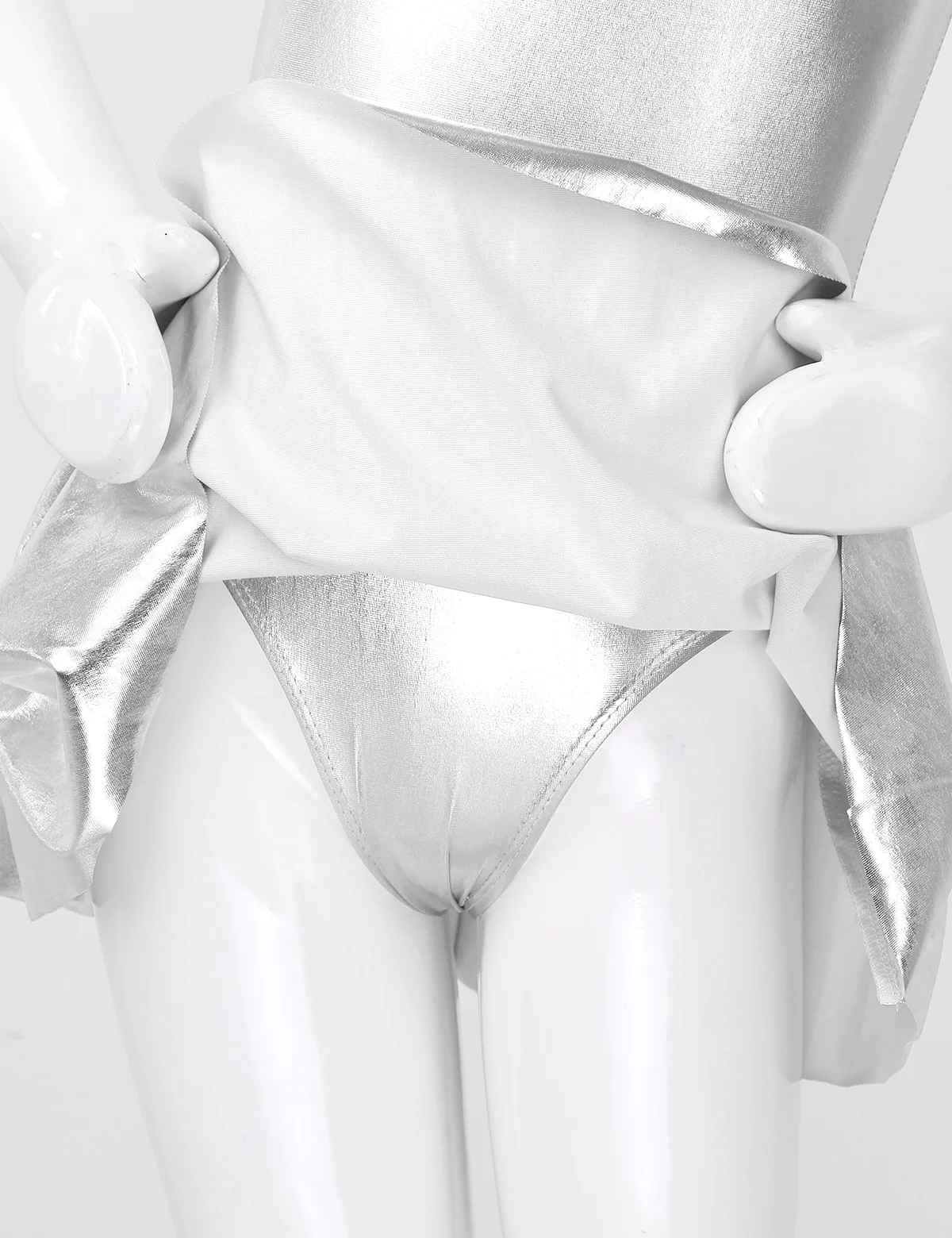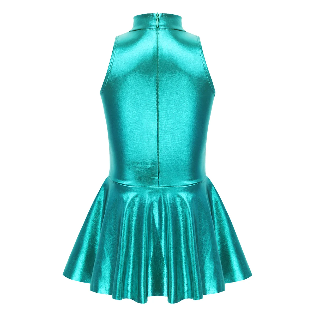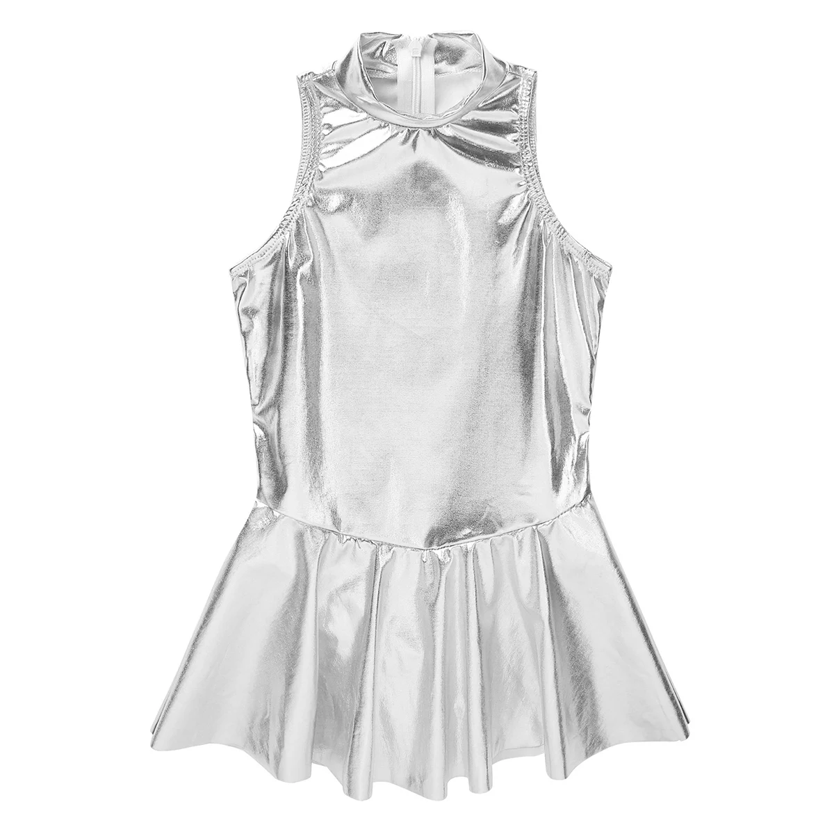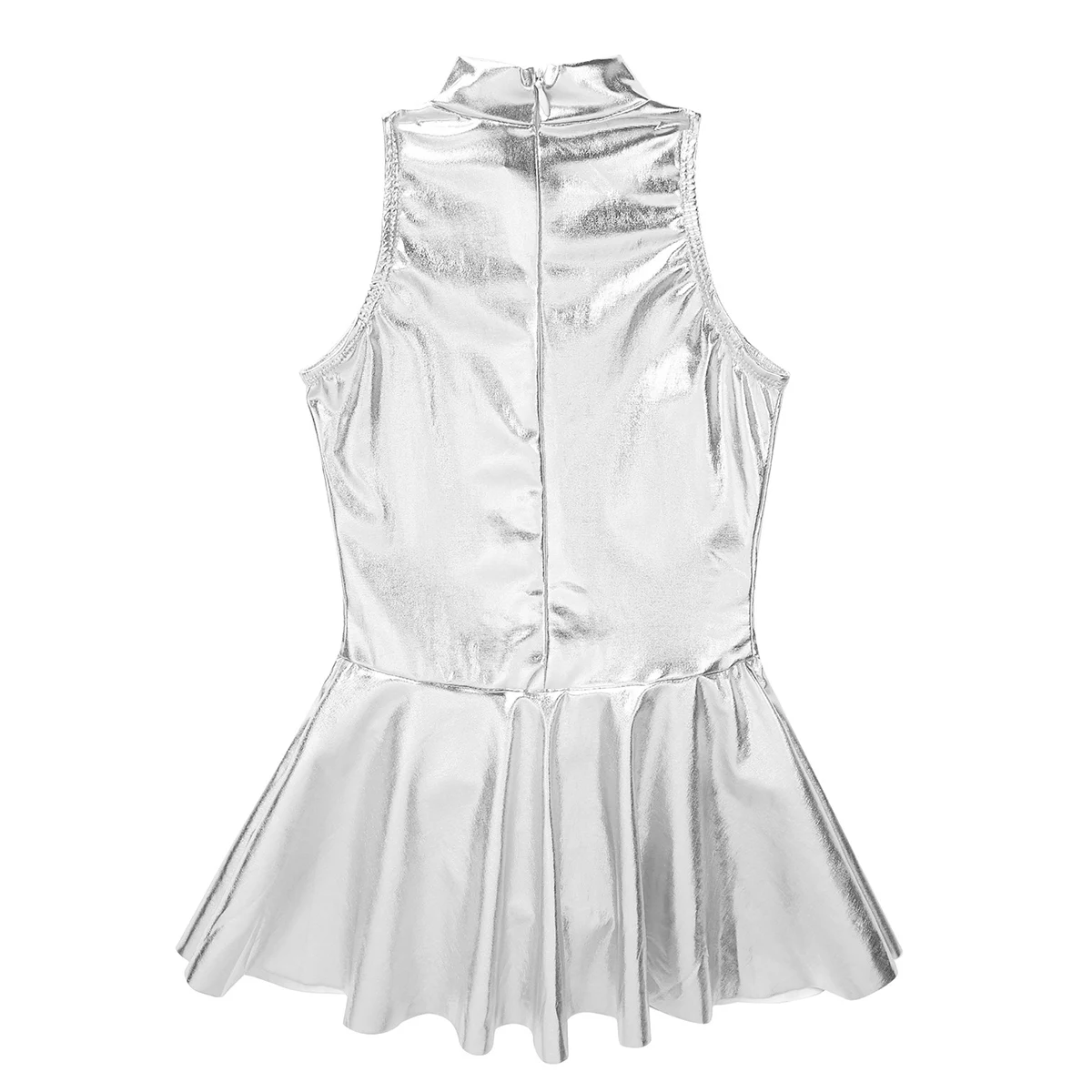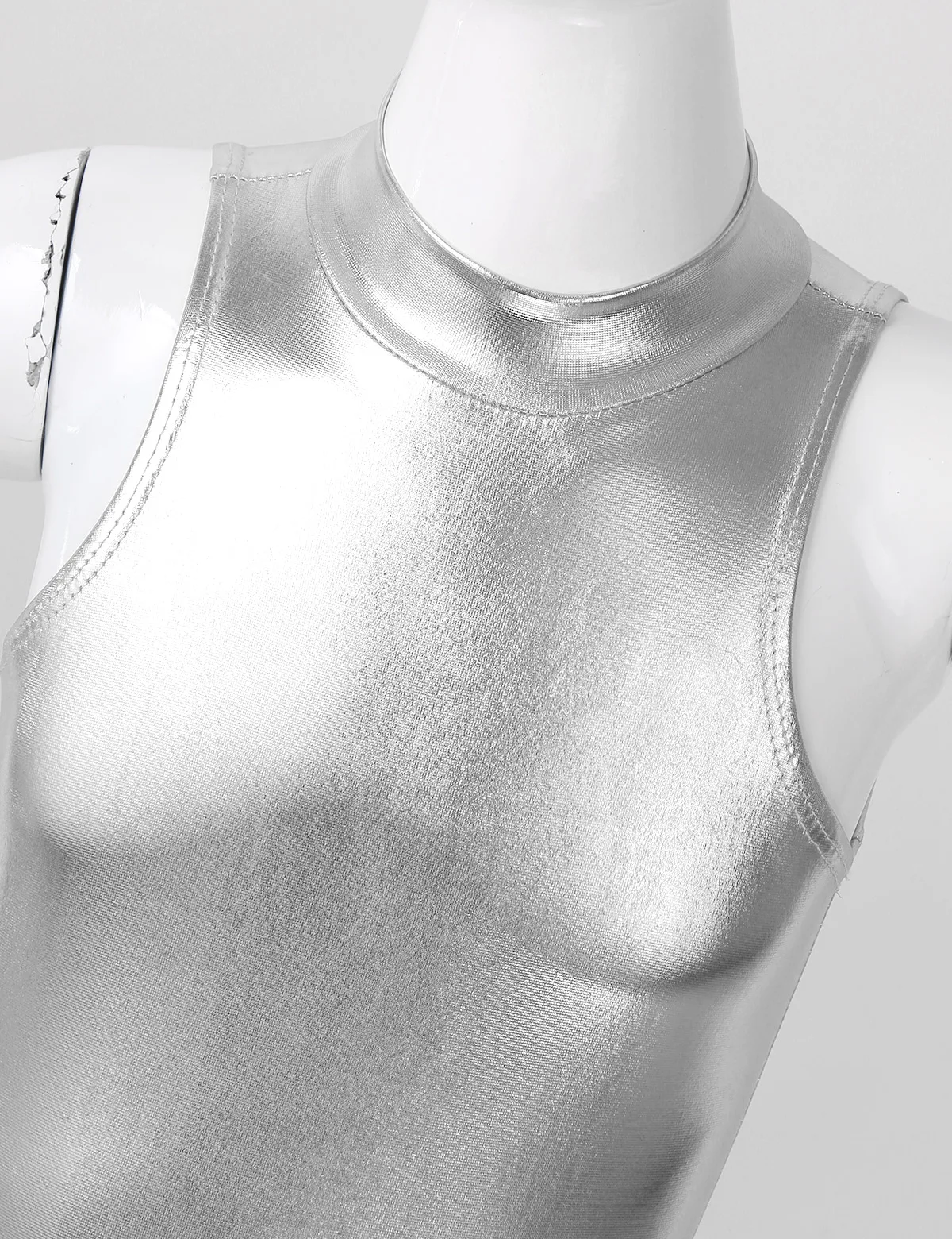 Без рукавов, с ложной горловиной, скрытая молния сзади для удобства одевания. Глянцевый внешний вид.