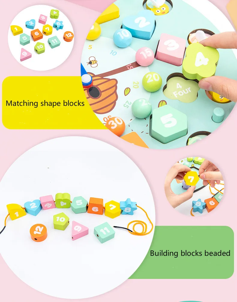 2. Бусины-головоломки, цветные деревянные бусины с цифрами, используйте палочки для еды или зажимы, чтобы положить их в соответствующие отверстия.
