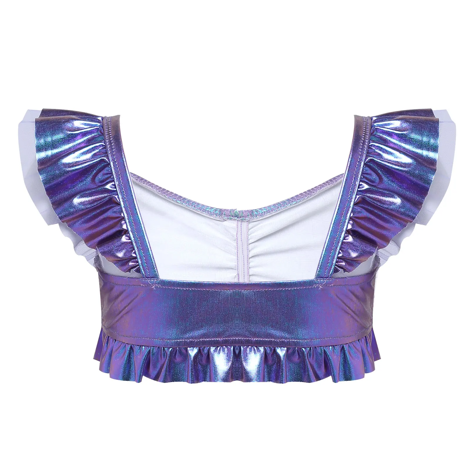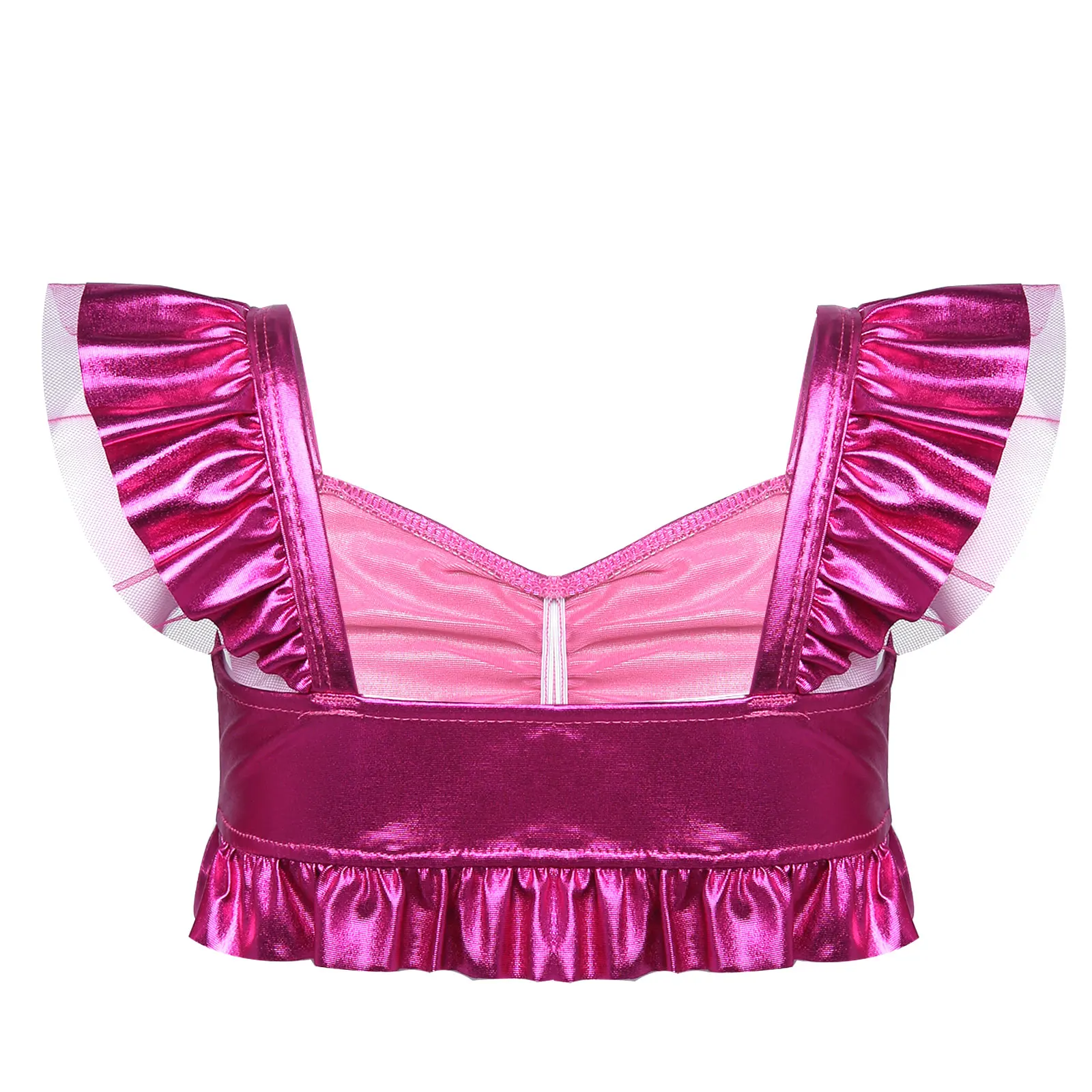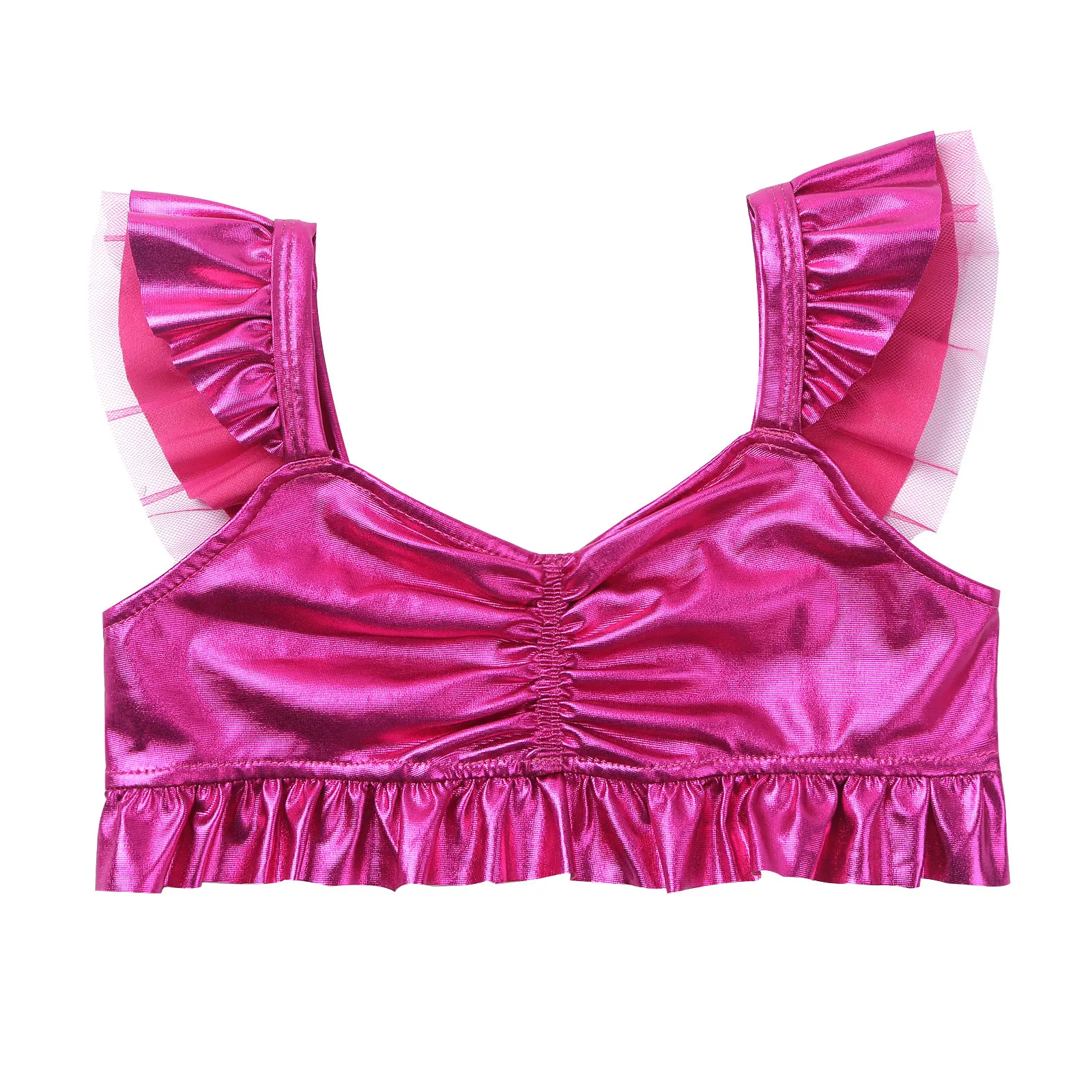 Ремешки на плечах, глянцевый металлический верх с лифом, низ украшен оборками.