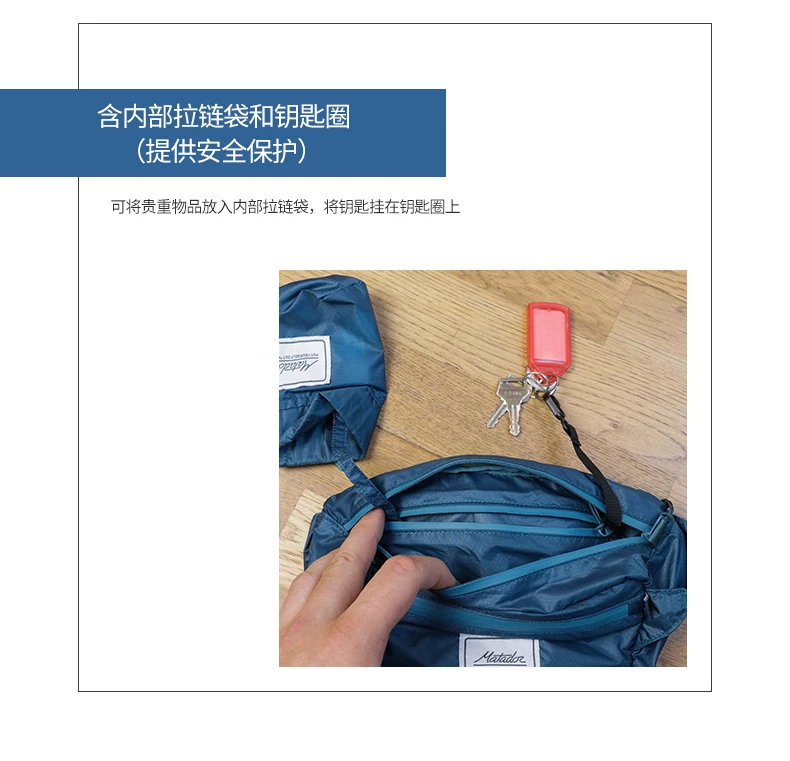 Название продукта: хип-пакет Matador Вес: 48 г Вес подшипника: 3,6 кг Размер в сложенном виде: 6,1*6,1*10,2 см Размер в разложенном виде: 24,1*14*6,4 см Материал: водонепроницаемая Кордура 30D