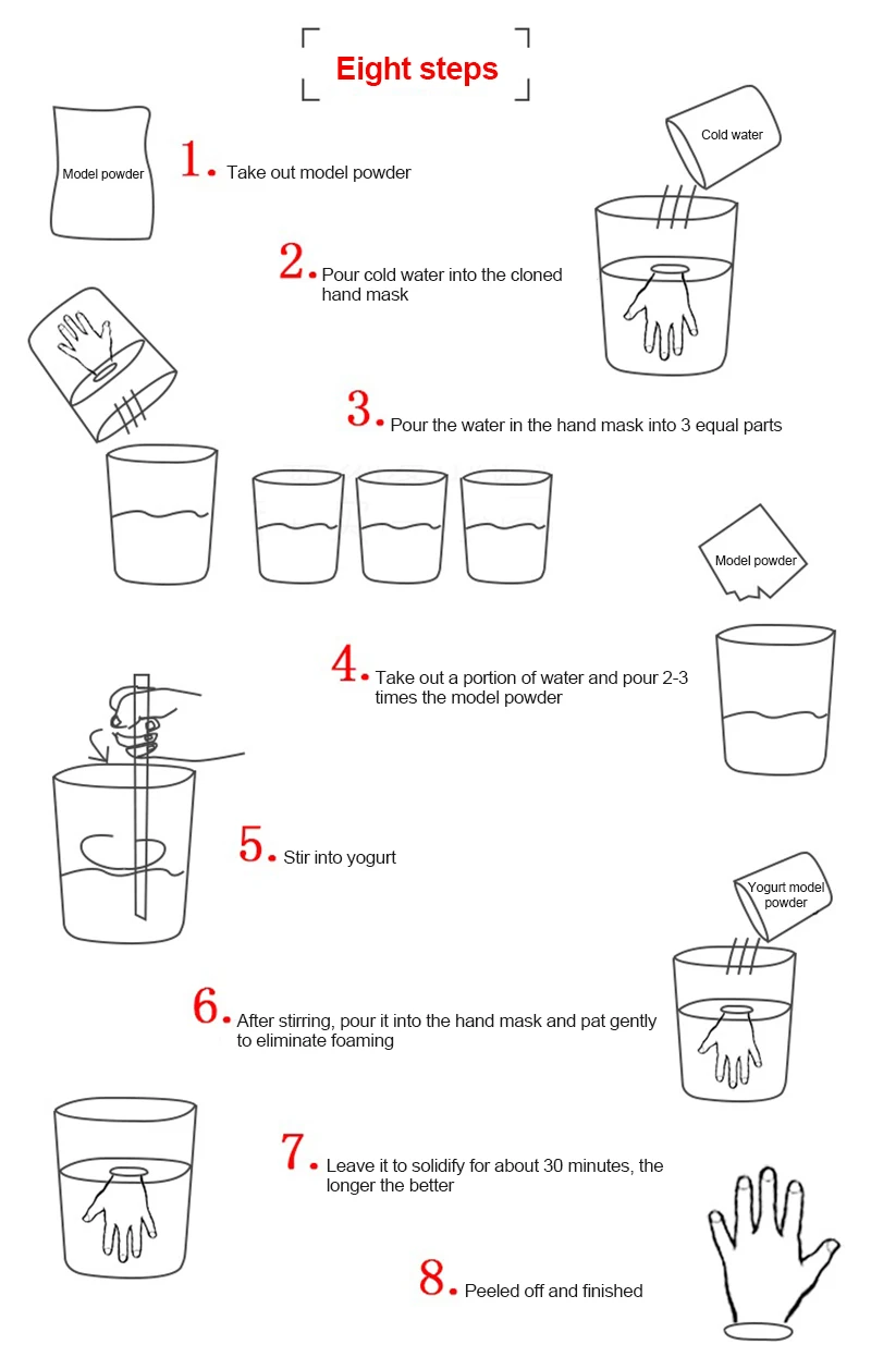 Изготовление форм: формовочный материал имеет холодную квалификацию, нетоксичный и не аллергенный. До тех пор, пока руки погружены в формовочный гель, раскачивание не является проблемой. Время установки составляет около 6 минут, включая время смешивания.