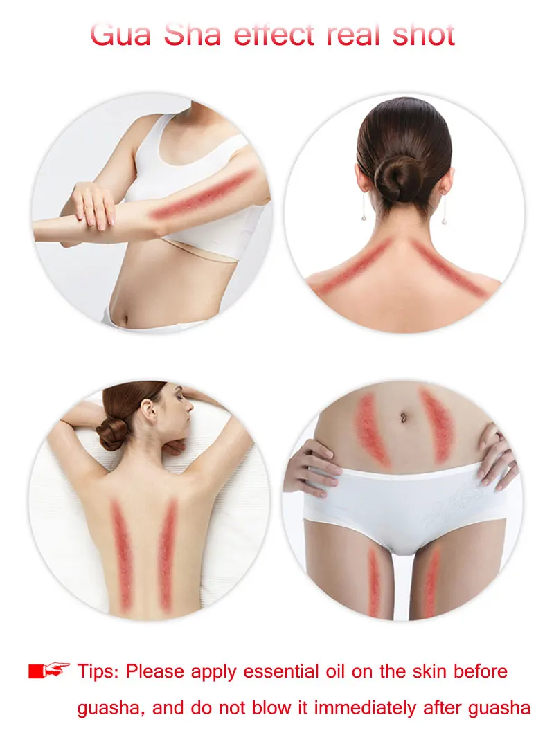 1. Забота о здоровье: гуаша-это Непрерывный массаж на коже. Это простое, практичное и экономичное лечение китайской медицины. 2. Баланс Инь и Ян: массаж соответствующих меридианов и акупунктурных точек через гуашу для устранения ветра, холода, сырости и тепла в организме и для улучшения здоровья человеческого тела 3. Улучшение иммунной системы: массируя поверхность человеческого тела, способствует циркуляции крови и гладкой для тела, меридиан, тем самым улучшая иммунитет организма