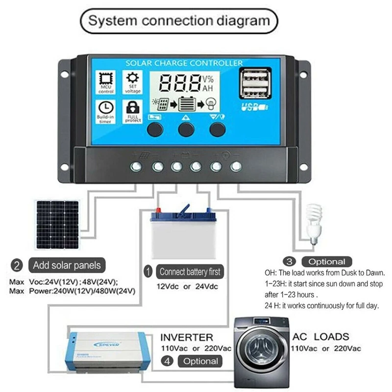 Подключение системы: 1. Подключите аккумулятор к регулятору заряда-плюс и минус. Он покажет 1, если обнаружит батарею 12 В, 2, если обнаружит батарею 24 В; 2. Подключите фотоэлектрический модуль к регулятору-плюс и минус; 3. Подключите потребителя к регулятору заряда-плюс и минус; Обратный заказ применяется при деустановке; Неправильный порядок последовательности может отбивать контроллер!