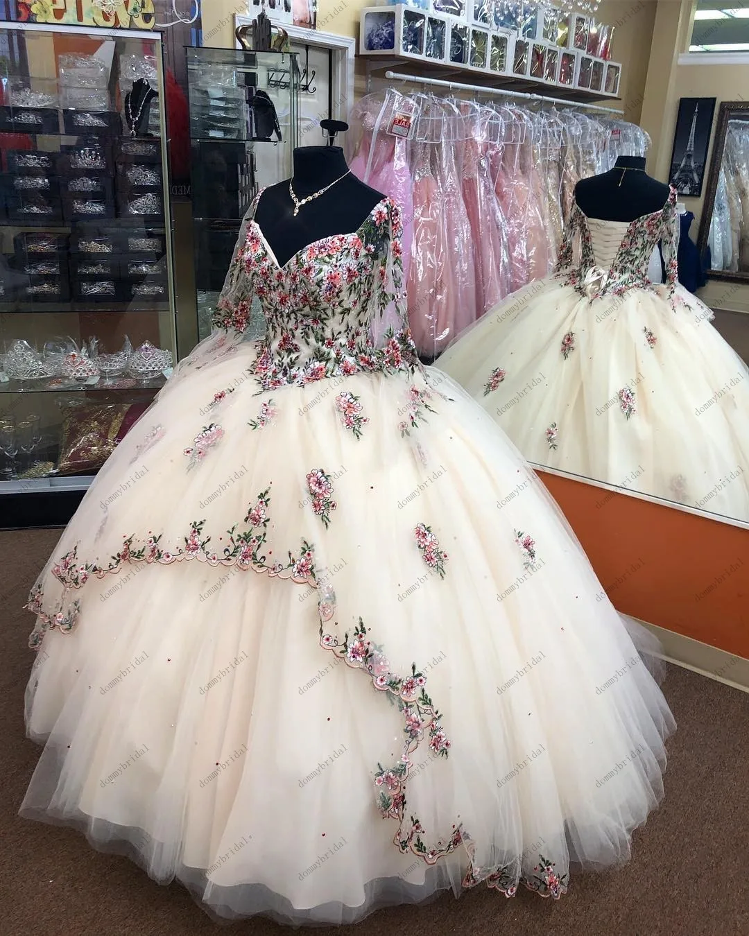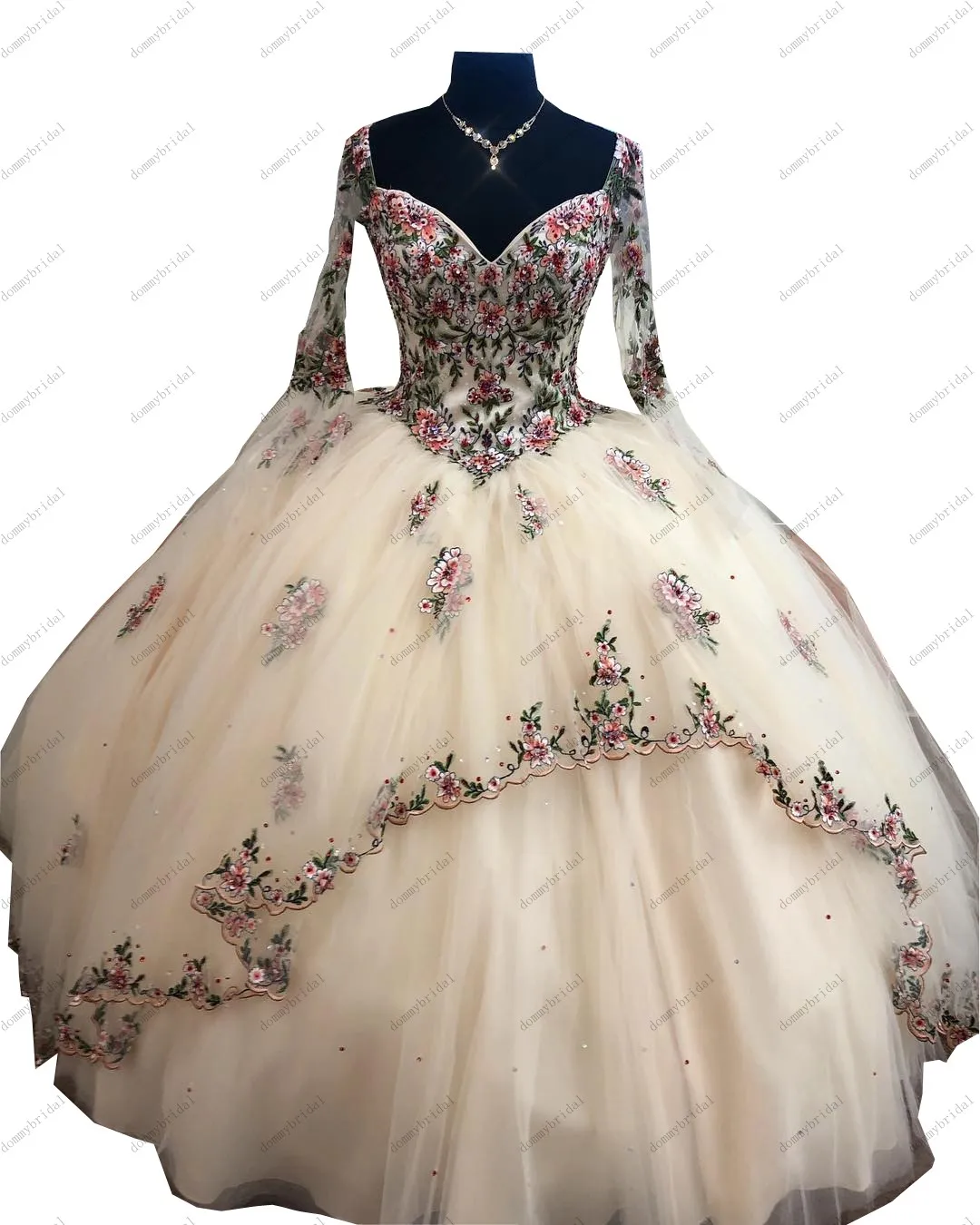 100% новинка, популярный 3D Цветочный Принт, мексиканские цветы XV, длинные рукава-иллюзии, мягкий тюль Begie, бальное платье, корсет на спине, длина до пола, дизайнер принцессы, vestido De 15 Anos Quinceanera вечерние выпускные торжественные Свадебные платья для гостей для женщин Милые 15 16 Бальные платья размера плюс для маленьких девочек