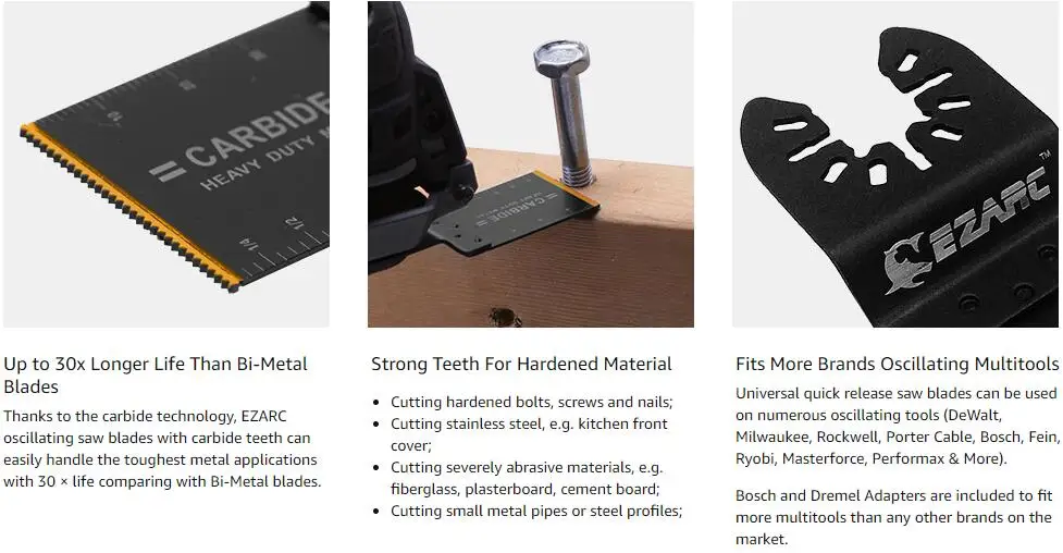 Твердосплавное лезвие EZARC длится в 30 раз дольше по сравнению с обычным биметаллическим вариантом в металле, высокоэффективные карбидные зубья позволяют разрезать бетонные гвозди, нержавеющую сталь, цементную доску, стекловолокно, листового металла, твердой древесины с легкостью.