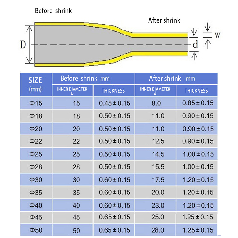 Length: 1 meter Color: Black Green Yellow Red and Blue Material: Polyolefine Shrinkage Ratio: 1.8:1 (will maximum shrink to 5/9 its supplied diameter) Operating Temperature: -55°C to +125°C Minimum Shrinkage Temp: +70°C Full Shrinkage Temp: +110°C Maximum Tensile Strength: 10.4 Mpa Dielectric Strength:15 kV/mm Length: Approx. 100cm/ 39.4 inch. Voltage rating : 600V