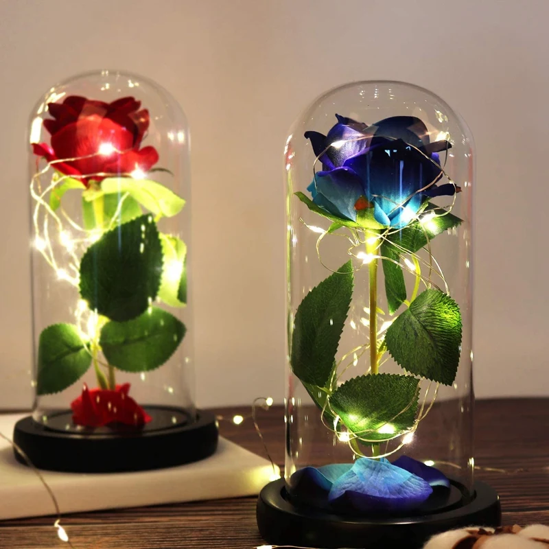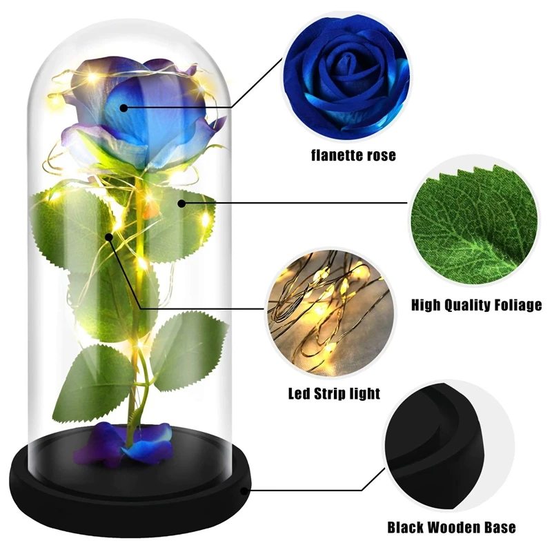 Unique design-rose ornaments, with colorful led lights, lovely glass dome with black wooden base (battery not included).