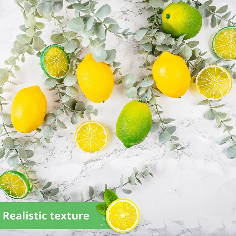 Реалистичные фрукты: Как вы думаете, вы можете отделить настоящие лимоны от наших имитационных? Подумайте еще раз! Лимон и лайм-фрукты изготовлены из высококачественного EPS, с маленькими веточками и реалистичным лаком, в то время как ломтики сделаны из верхнего ПВХ, с профессиональным дисплеем riba, поэтому они могут легко ошибиться за настоящие