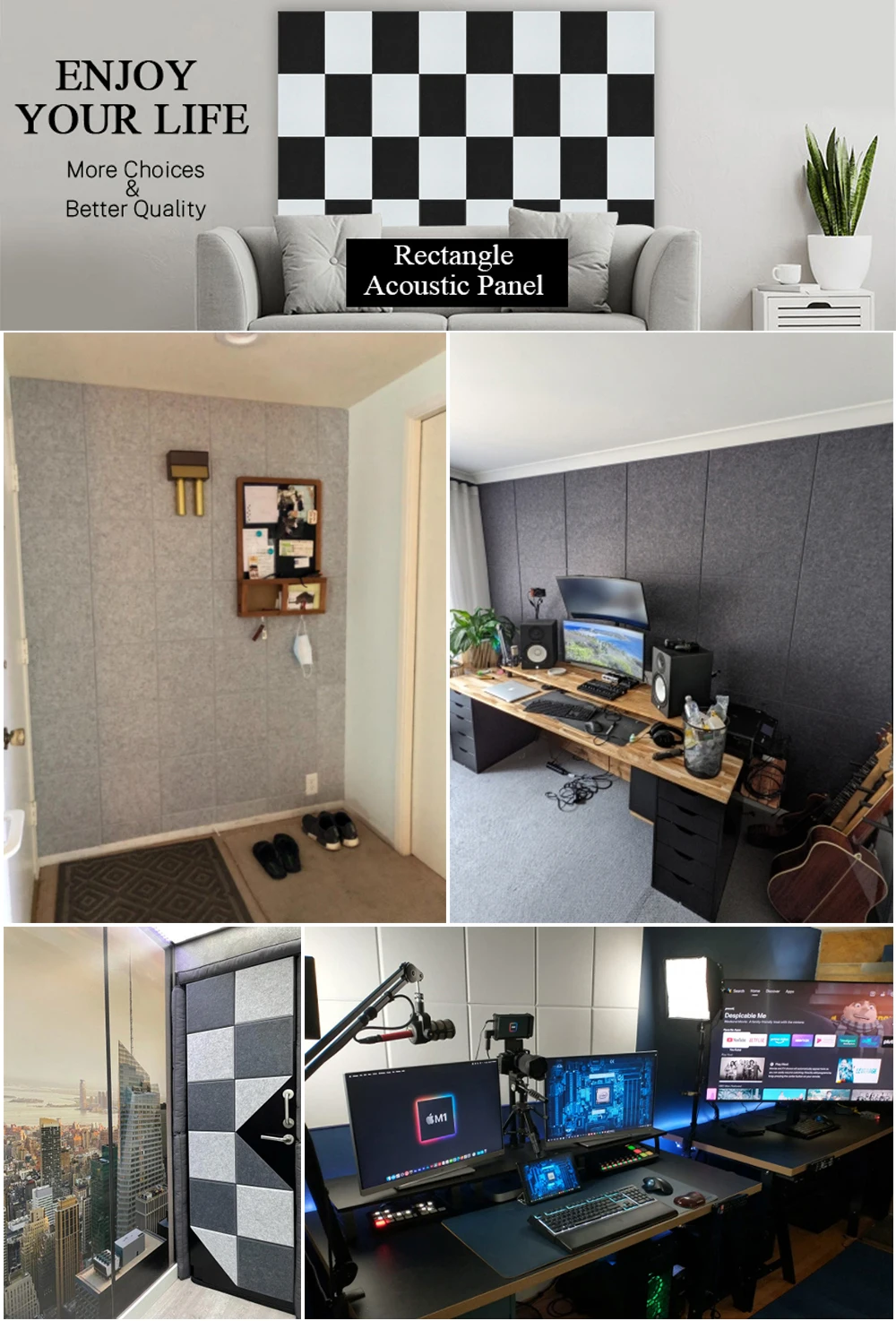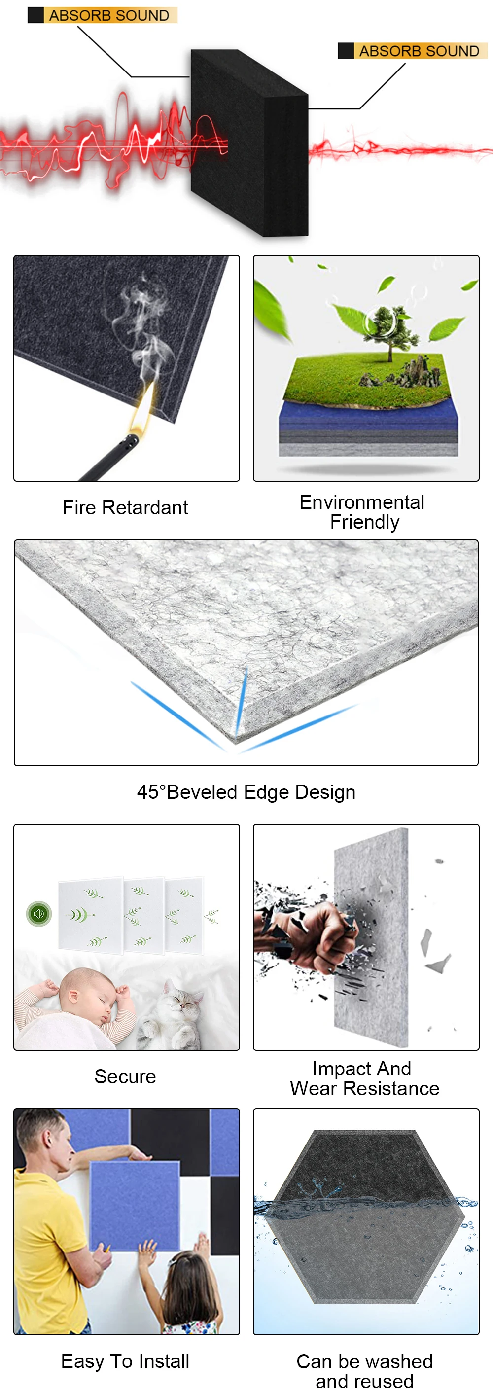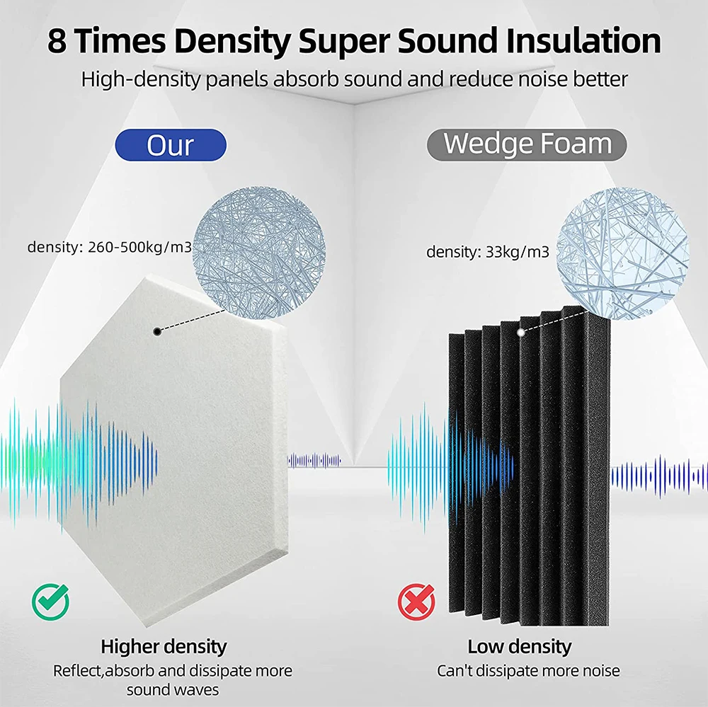 Название продукта Акустические панели Материал Экологически чистое полиэфирное волокно Цвет 48 цветов (см. Таблицу цветов на странице) Параметры Маленький Шестигранник: 30*26 см Большой Шестигранник: 36*31 см Площадь: 30*30 см Прямоугольник: 30*40 см Девять сеток: 30*30 см *** Предложение продавца *** Украшение, пожалуйста, выберите Толщина: 0,7-0,8 см (тихий звук работы поглощающим эффектом) Толщина: 0,8-0,9 см (средний звукопоглощающие эффект) Толщина: 0,9-1,0 см (высокий звуковой эффект поглощения/высокого качества) Толщина: 1,1-1,2 см (расширенная Высокое звукопоглощение) Особенности 1: защита окружающей среды, звукопоглощение, огнестойкость, Особенности 2: отсутствие запаха, отсутствие токсичности, отсутствие формальдегида Особенности 3: многоразовые, моющиеся, не деформированные, не сжимающиеся, содержащие огнестойкие материалы, подходят для предотвращения огня в общественных местах Сцены для использования ТВ фоновая стена, спальня, гостиная, детская комната, профессиональная студия, комната для репетиций, концертный зал, Подкаст, церковь, домашний кинотеатр, вокальный зал, домашняя студия, офис, питомник и т. Д .. *** Примечания к покупке *** Из-за различных партий, продукт может иметь небольшую разницу в цвете Этот продукт имеет определенную степень гибкости, и размер будет иметь погрешность 1-2 мм Те, кто возражает, Пожалуйста, разместите ваш заказ тщательно