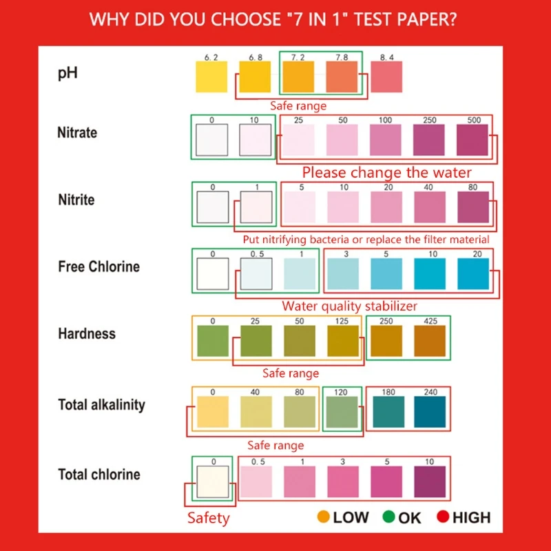 2. 7 способов тестирования-каждая полоса точно тестирует PH, нитрат, нитрит, твердость, свободный хлор, общий хлор и полную Щелочность. Кроме того, каждая бутылка поставляется с карточкой для понимания, чтобы помочь вам понять результаты теста.