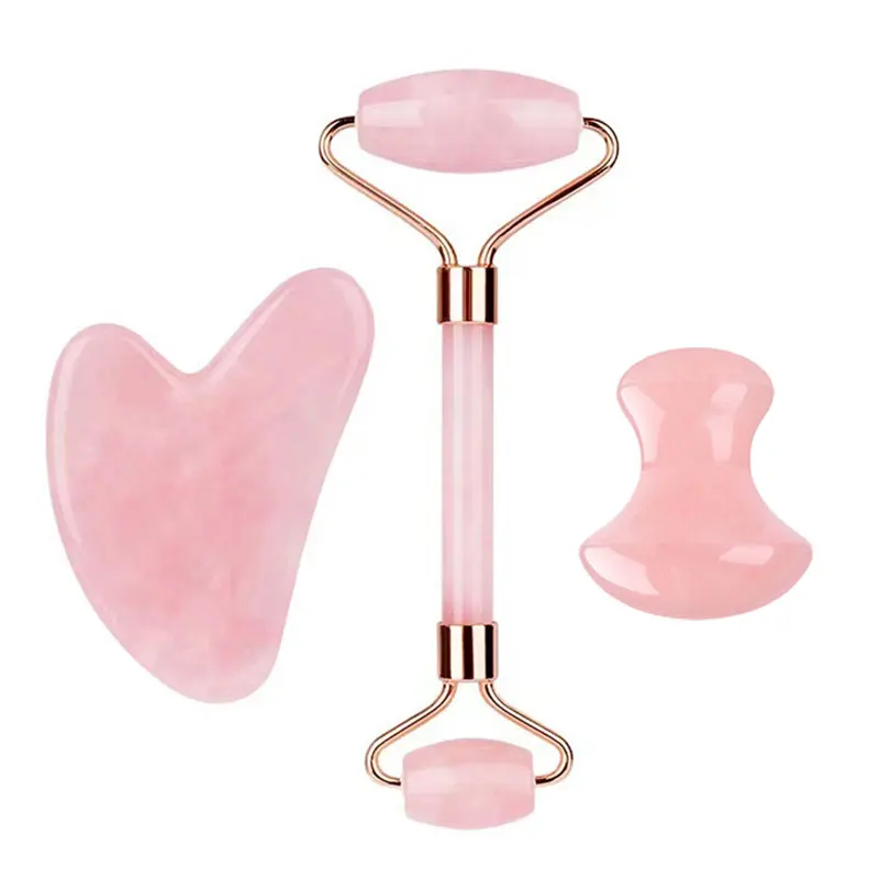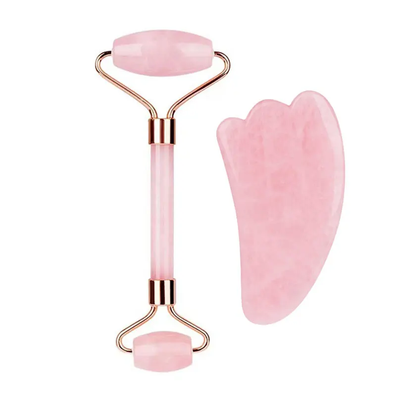 Розовый кварц розовый кристалл лицо нефритовый ролик Набор Gua sha гуашь скребок натуральный розовый кристалл ролик массажер для лица Инструменты для красоты