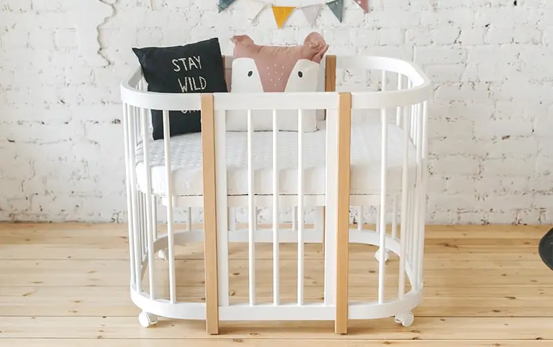 Кроватка имеет современную практичную овальную форму
