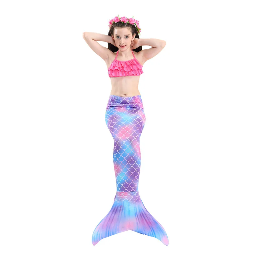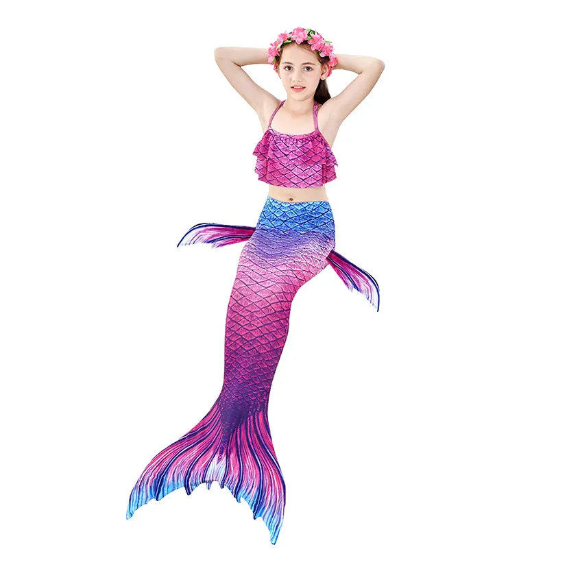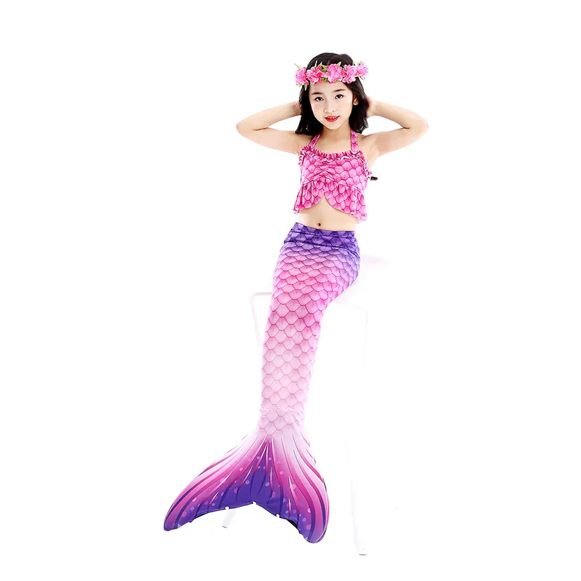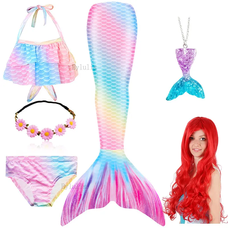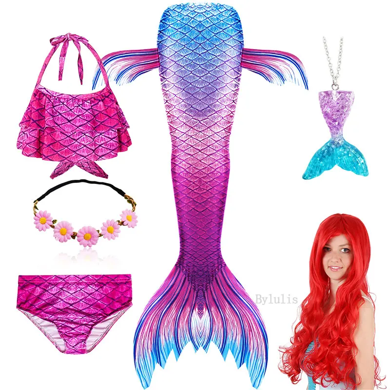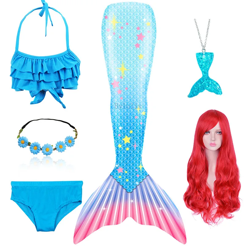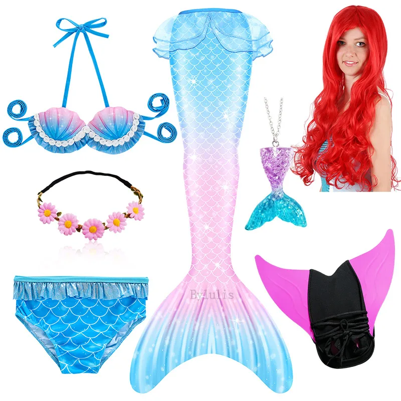 Комплект из 7 предметов: 1 юбка с хвостом русалки + 1 Топ + 1 шорты + 1 ожерелье + 1 гирлянда + 1 парик + 1 монофин для плавания
