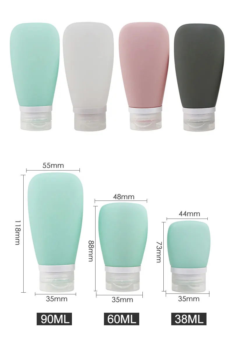 Тип товара: дорожные наборы, бутылки для эфирных масел, бутылки для лосьонов, косметические бутылки, косметические банки, косметические шланги Материал: силиконовый пластик разновидности: ABS Сопутствующие аксессуары: ПП Обработка поверхности: матовая Емкость: 38 мл, 60 мл, 90 мл