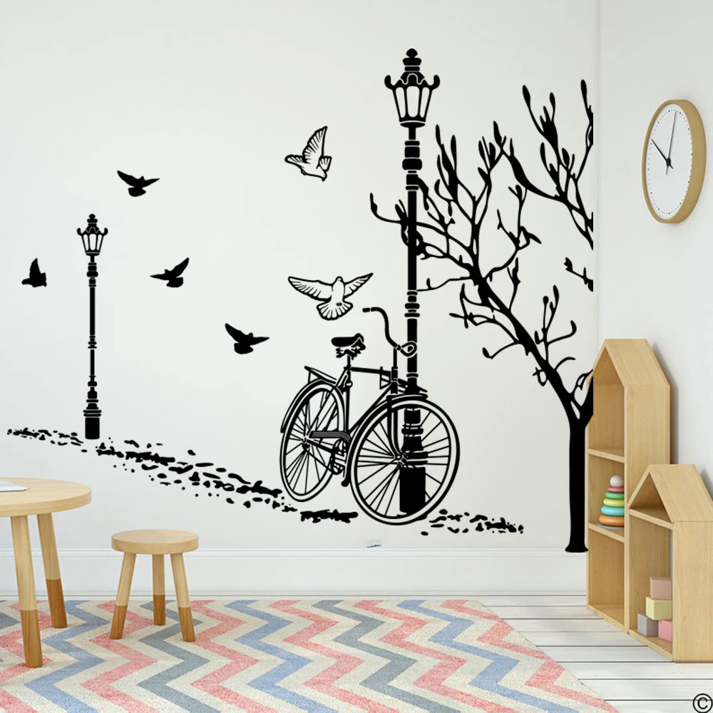 Большой осенний велосипед уличный фонарь дерево птица настенные наклейки для гостиной