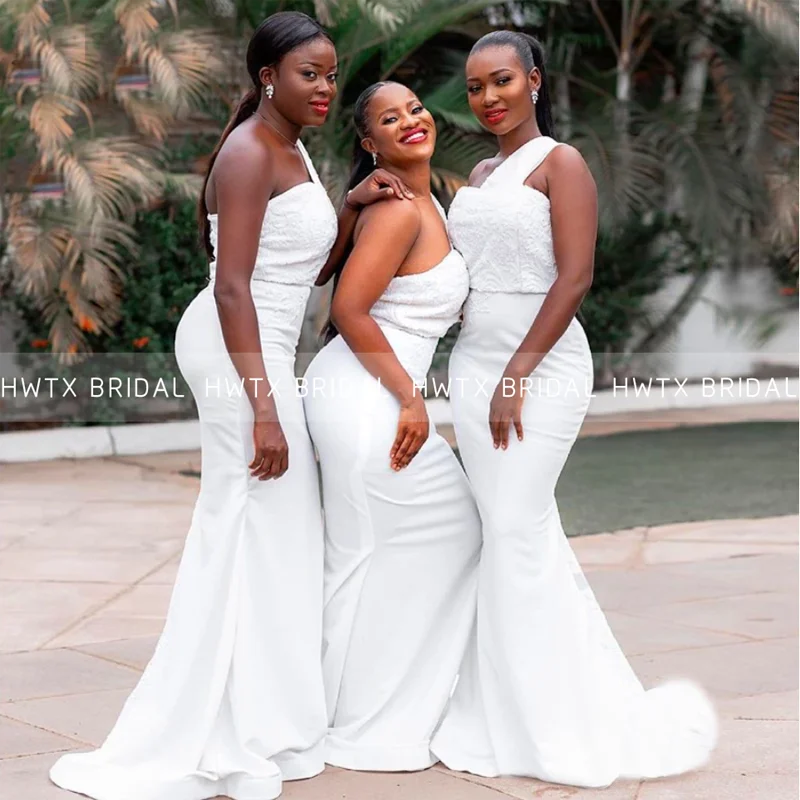 Элегантное белое платье подружки невесты, кружевное атласное платье подружки невесты на одно плечо, длинное платье подружки невесты в африканском стиле, платье для свадебной вечеринки