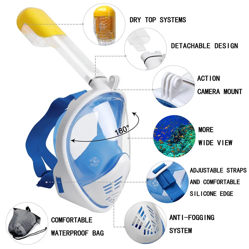 Маска для подводного плавания обеспечивает панорамный вид на 180 ° под водой, что делает его легче дышать при сноркелинге и помогает вам лучше понять подводный мир! Оснащен съемным креплением для камеры, он может дать вам более удобный способ записи вашего счастливого времени.