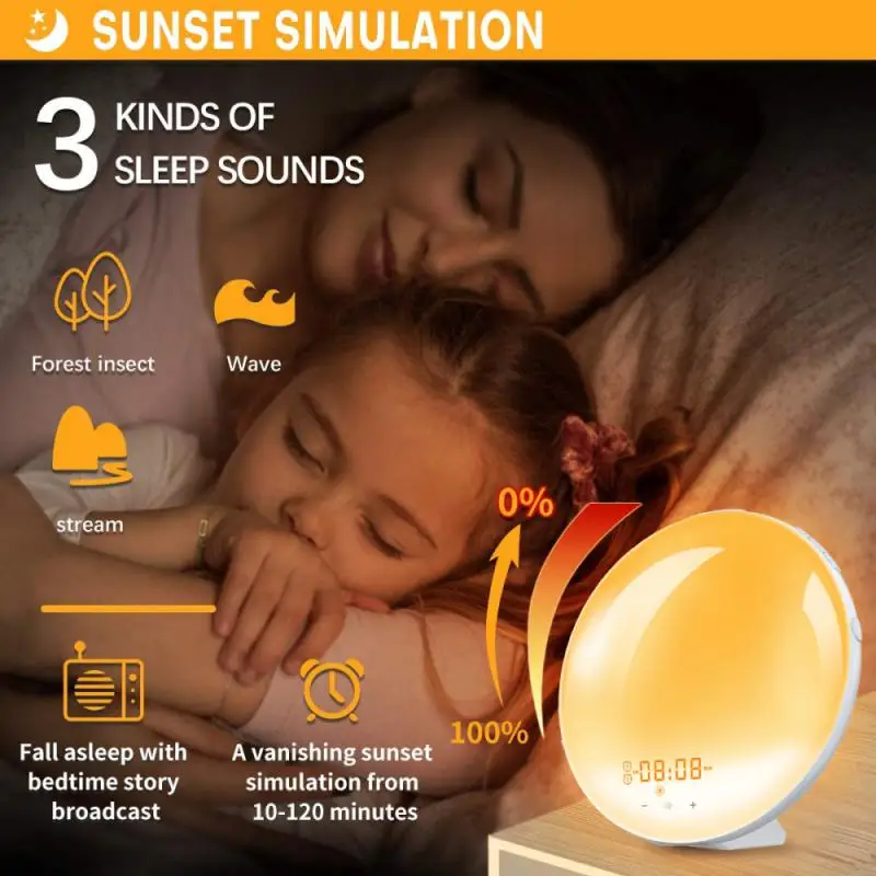 FM radio wake-up alarm clock sunrise and sunset wake up sleep aid colorful ambient light white noise with sleep night light