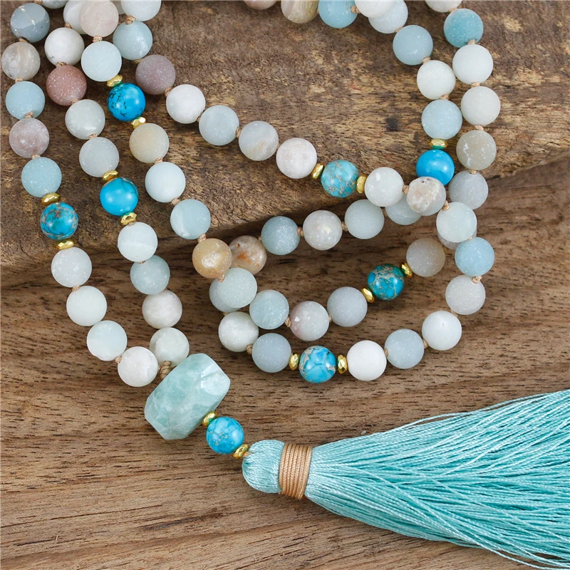 Матовый Amazon Stone бусины Цепочки и ожерелья с голубой кисточкой