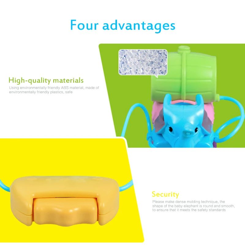 2. Гарантия безопасности: прецизионное литье, форма детского слона круглая и гладкая, чтобы гарантировать, что она соответствует стандартам безопасности, и не повредит маленькие руки ребенка