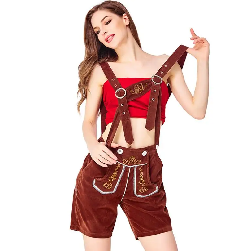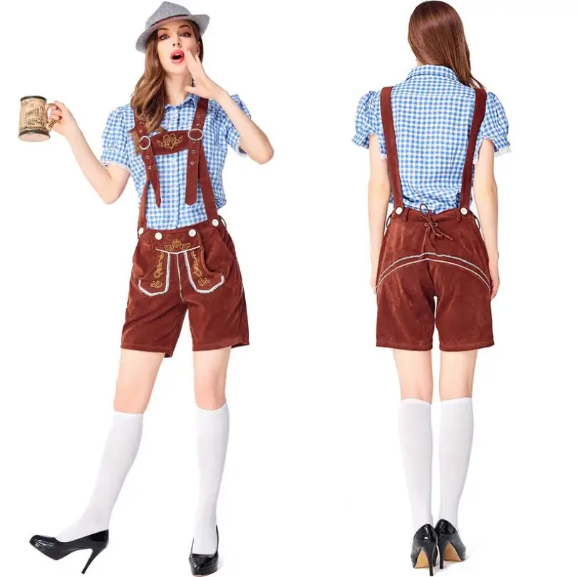 Прямая поставка, Германия, Октоберфест, костюм для мужчин и женщин, традиционный фестиваль, Баварская клетчатая рубашка, брюки на бретельках, наряд пивной официантки