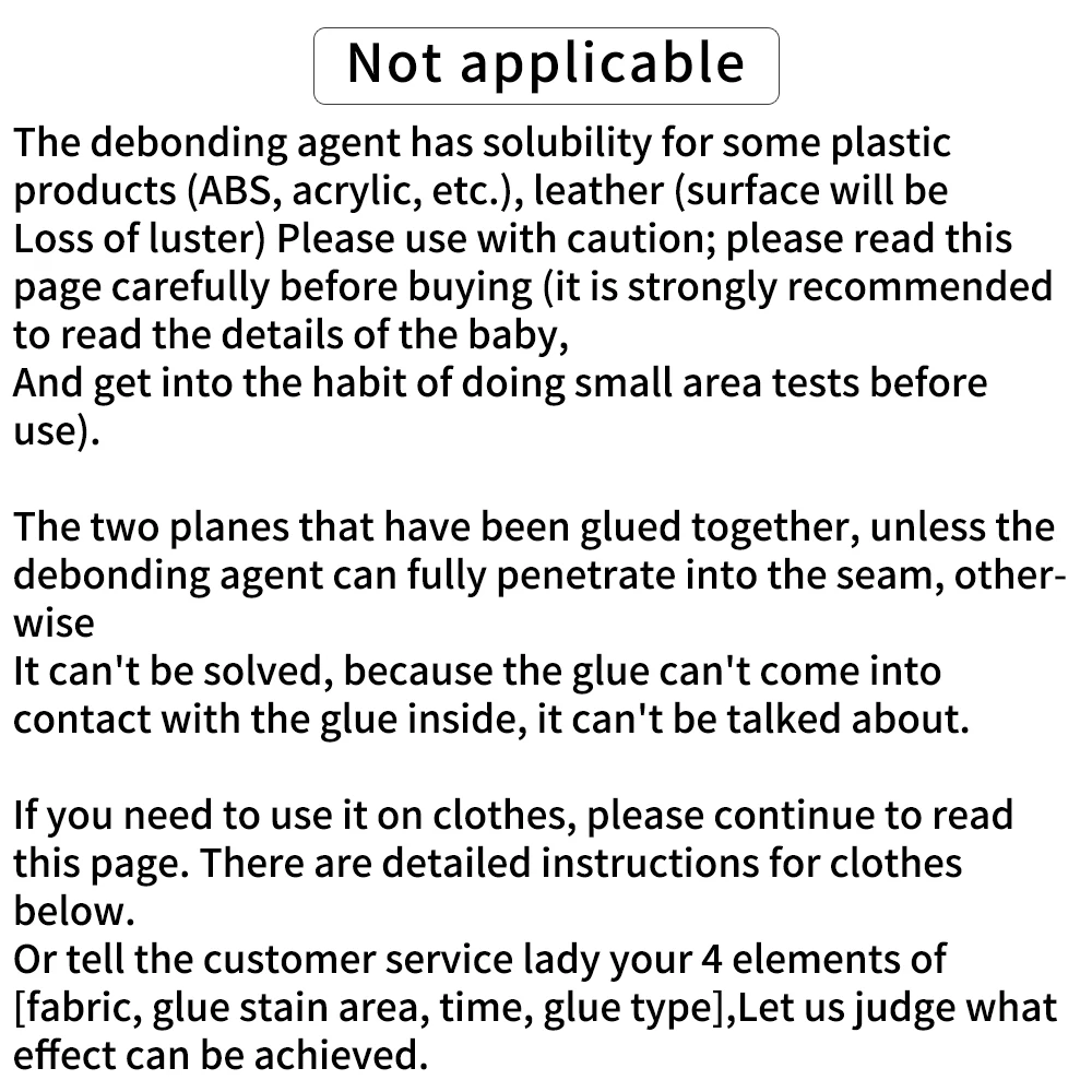 The debonding agent has solubility for some plastic products (ABS, acrylic, etc.), leather (surface will be