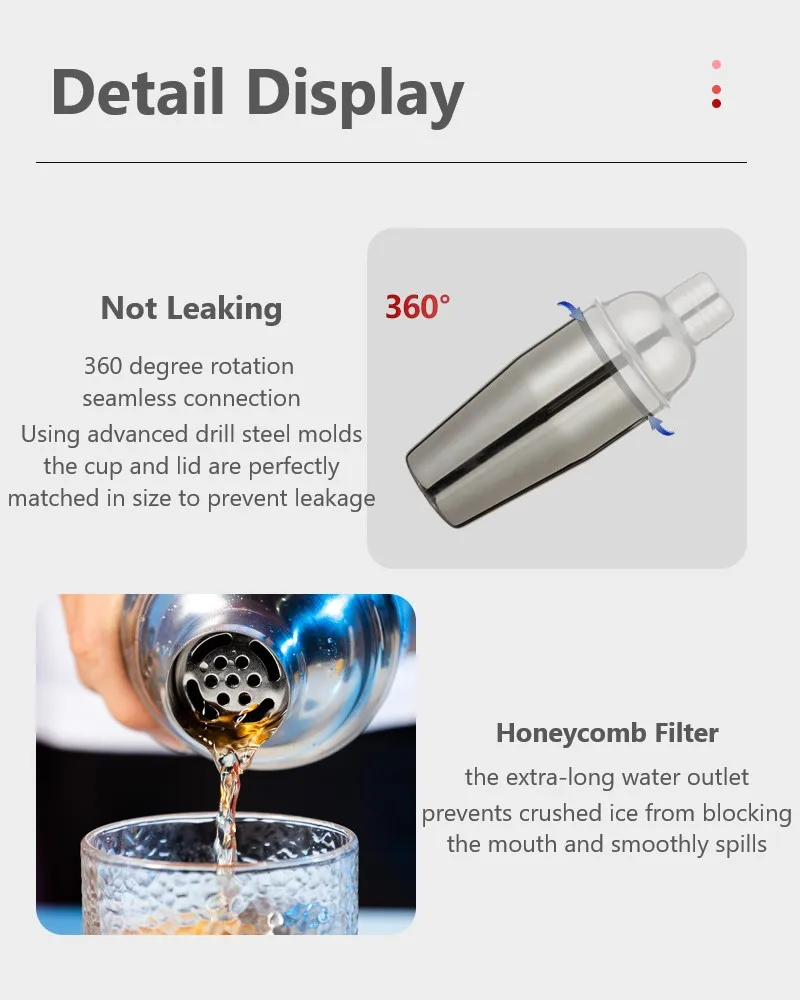 [Высококачественный материал из нержавеющей стали] набор шейкеров для коктейлей изготовлен из высококачественной нержавеющей стали. Он безвреден для здоровья, прочный, герметичный, светильник, не легко царапается, не ржавеет, устойчив к царапинам, не деформируется и легко моется. Шейкер для коктейлей легко чистить вручную теплой мыльной водой и легко поддерживает блеск, добавляя современное искусство в домашний бар.