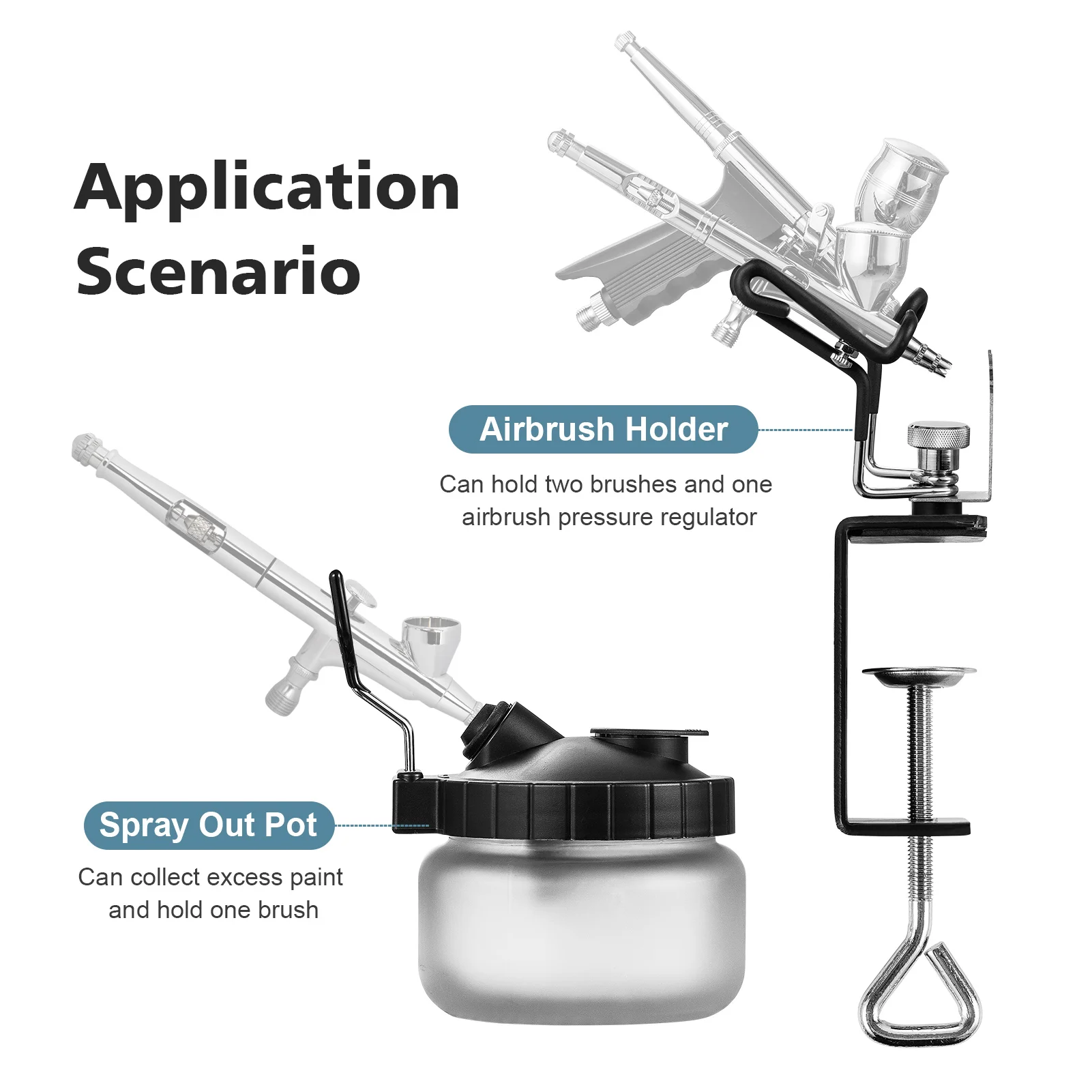 Универсальный держатель Аэрограф предлагает две стойки для кистей, которые могут поместиться практически в любые стили Аэрограф, и может вращаться влево вправо для удобного использования.