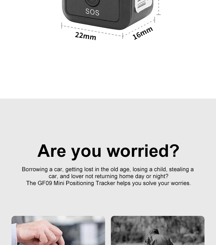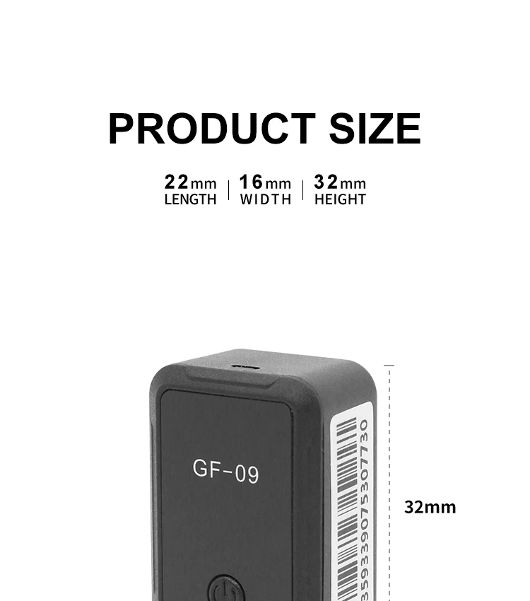 GF-09 мини gps-трекер, автомобильный GPS локатор, Противоугонный трекер, gps-трекер, устройство для отслеживания записи, голосовое управление Описание: 100% новый товар высокого качества. Многофункциональный дизайн, встроенная сильная Магнитная функция. Удаленный пикап, удаленная запись, приложение. Прослушивание, запись голоса, голосовое управление обратным звонком, отслеживание в реальном времени, ударная сигнализация, SOS один ключ для помощи, историческая траектория. Комплексная поддержка WiFi, LBS, GPS и BEIDOU. Силиконовый микрофон высокой четкости, электронный забор. Поддержка различных режимов энергосбережения. Напоминание о низком заряде батареи, пульт дистанционного управления, Бесплатная установка. Только локатор, другие демонстрационные аксессуары на картинке не включены! Характеристики: Тип товара: локатор Номер модели: GF09 Поддержка памяти: TF карта 32 Гб (не входит в комплект) Емкость аккумулятора: 350 мАч Точность позиционирования: 10-50 метров Диапазон записи: 80 квадратных метров Вид платформы: SMS + Приложение + компьютер Материал: пластик Размер: 3.3x2.2x1.6 см/1.2x0.8x0.6in Цвет: черный Количество: 1 шт. Примечание: Перевод ед. измерения: 1 см = 10 мм = 0,39 дюймов Возможны отклонения в 0-1 см вследствие измерений вручную. Пожалуйста, убедитесь, что вы не возражаете, прежде чем сделать ставку. Из-за разницы между различными мониторами изображение может не отражать фактический цвет изделия. Спасибо! Посылка включает в себя: 1 x локатор 1 x зарядный кабель