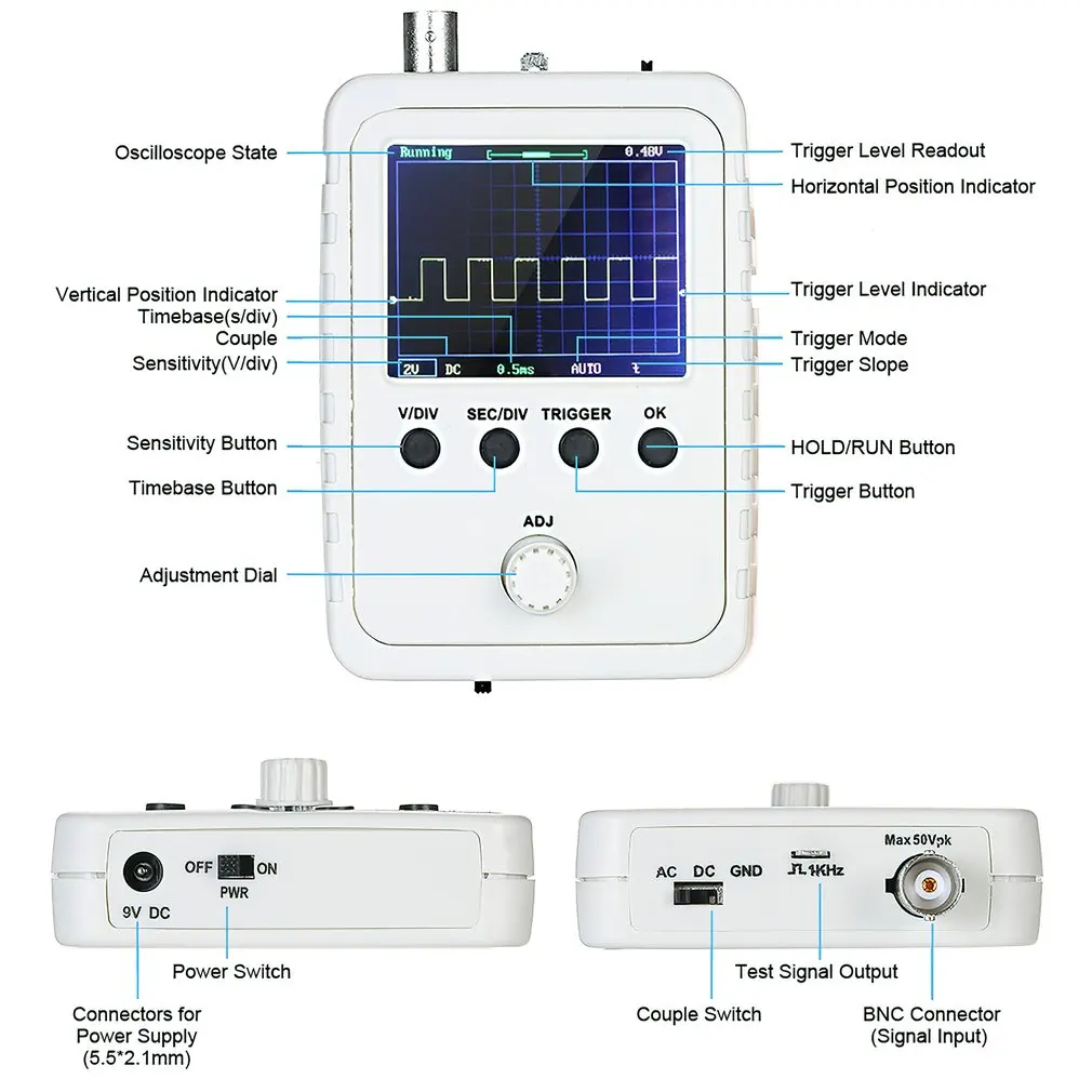 Особенности:1. Изготовлены по Cortex-M3 процессор (STM32F103C8), и включает в себя 2,4 цветным экраном тонкопленочной технологии (тпт).2. Используется для вторичной разработки на основе этого набора, например, он может быть изменен на милливольтметр, регистраторы данных.3. С цифровым дисплеем параметров формы волны, включая частоту, период, ширину импульса, коэффициент нагрузки, Макс./мин./AVG./пиковые/виртуальные значения.4. Функция хранения сигналов: не потеряет эту форму сигнала после выключения питания.5. Обнаружение короткого замыкания и открытого замыкания: может помочь этому пользователю узнать об этой ошибке пайки. Функция распознавания контроллера TFT. SMD был припаян, больше подходит для начинающих электроники.6. Простота установки и эксплуатации. С автоматическим/нормальным/одиночным триггером, легко запечатлевает этот момент. Availe rising или falling fringe trigger. Наблюдательная предыдущая форма сигнала перед запуском (отрицательная задержка). Может замораживать дисплей формы волны в любое время (функция удержания). Описание:Набор DIY используется для вторичной разработки на основе этого набора, например, его можно изменить на милливольтметр, регистраторы данных. Характеристики:Тип вилки: США, ЕС (опционально)Максимальное время в режиме реального времениЧастота дискретизации: 1MSa/sАналоговая полоса пропускания: 0-200 кГцДиапазон чувствительности: 5мв/div-20mV/idvМаксимальное входное напряжение: 50Vpk (1X зонд)Входное сопротивление: 1 м Ом/20 пФТочность: 12 битДлина записи: 1024 точекРежимы соединения: DC / AC / GNDДиапазон времени: 500s/Div - 10us / DivРежимы запуска: автоматический, нормальный и одиночныйПоложение триггера: Центр буфераНапряжение питания: 9 В постоянного тока (8-10 В)Потребление тока: ~ 120mA 9VОсновная плата Размеры: 94*65 мм/3,7 * 2.56inАналоговой платы Размеры: 65*47 мм/2,56 * 1.85inРазмер экрана: 52*40 мм/2*1,57 дюйма Посылка включает в себя:1 комплект * Полностью Собранный цифровой осциллограф1 шт * зонд1 шт. * Руководство пользователя