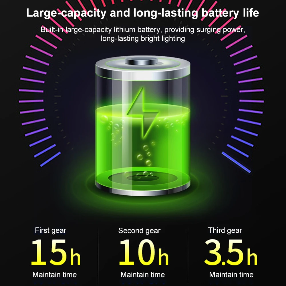 2. Встроенный аккумулятор большой емкости, длительный срок службы батареи, освещение высокой яркости, дальнее освещение, широкий диапазон, высокая яркость и четкое видение.