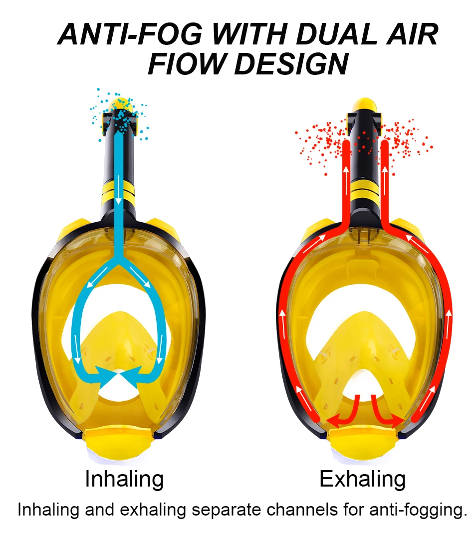 1. Легкое дыхание и противотуманная конструкция:Эта маска для лица с трубкой позволяет пользователю дышать легче, чем традиционная с трубкой для рта. Трубка с трубкой позволит вам нырять глубже. Отдельные вдыхательные и выдыхающие каналы, которые помогают устранять запотевание и будут держать вас Сноркелинг дольше.