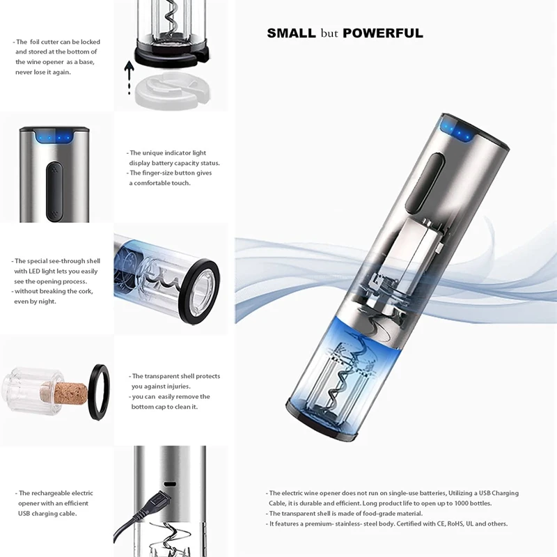 [Мульти-использование. Легкое хранение] Набор Винных принадлежностей включает usb-кабель для зарядки, фольга резак, perfectдля любителей вина. Устройство для удаления фольги можно заблокировать и хранить в нижней части открывателя для бутылок в качестве основы, никогда не теряйте его снова.