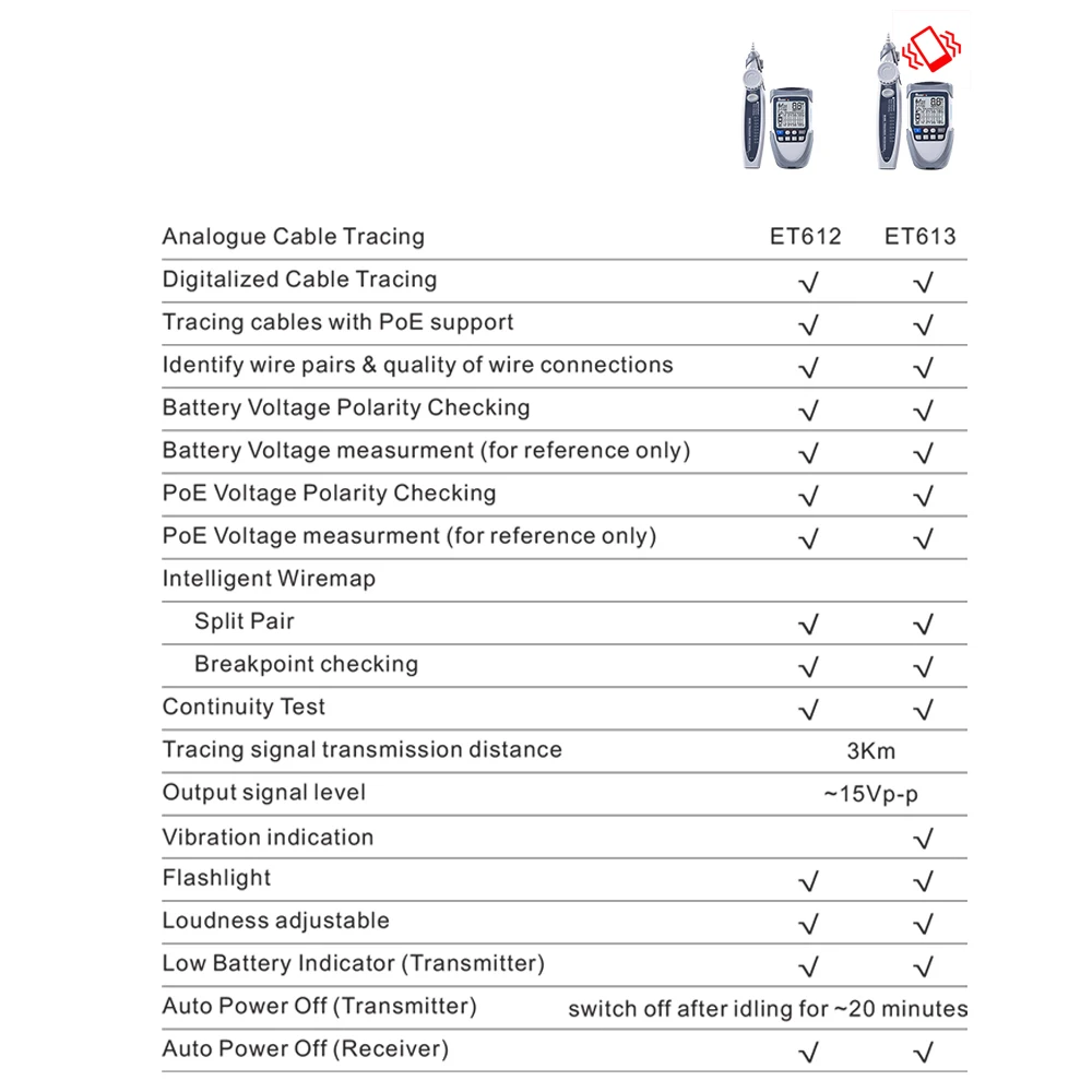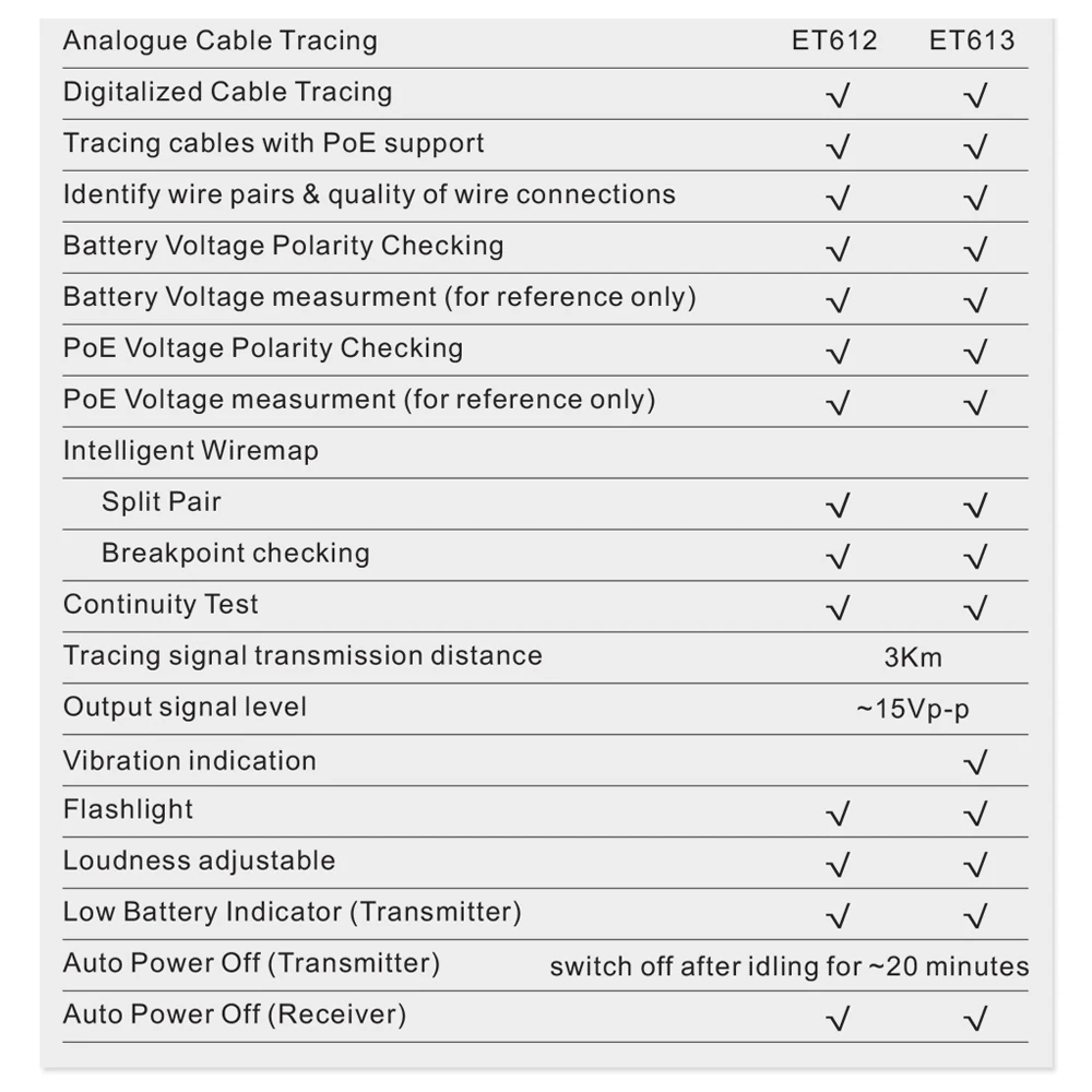 Функция тестирования POE: этот инструмент используется для тестирования стандартного и нестандартного устройства POE, он также может тестировать напряжение POE, полярность питания и режим питания.