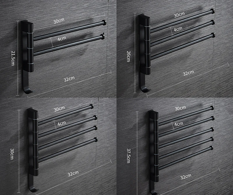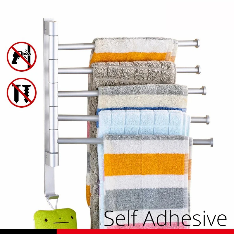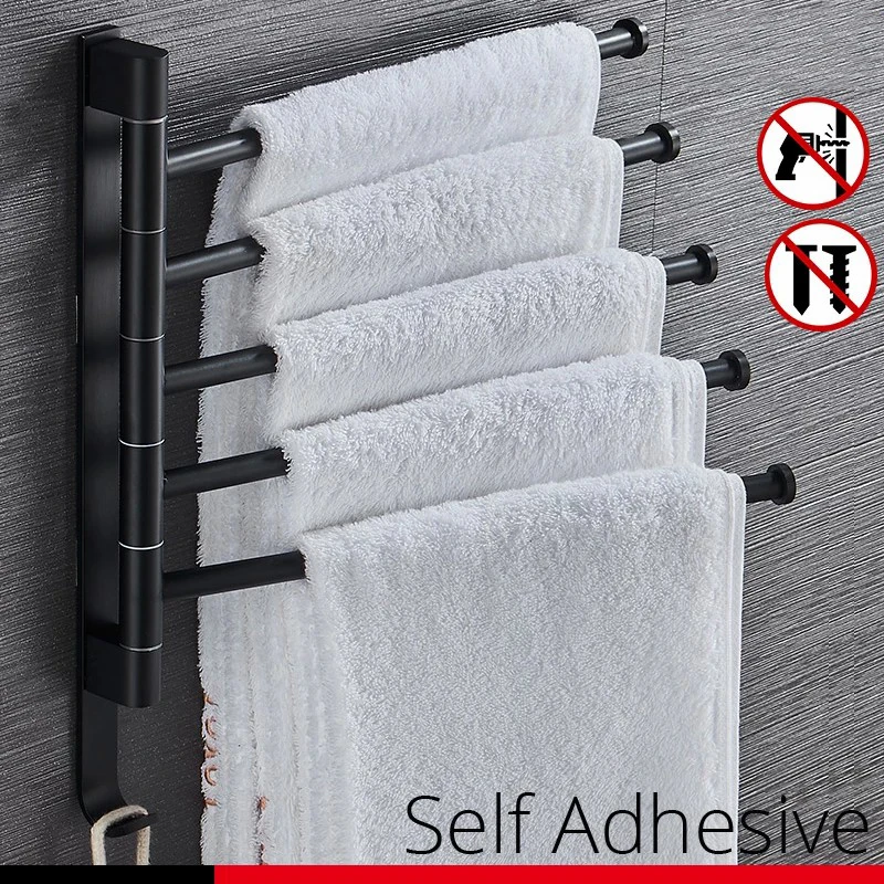 Self Adhesive Nail Free Towel Bar Black Brushed Multi Arm Swivel Adjustable Towel Bars Holder Rotating Bathroom Kitchen Rack