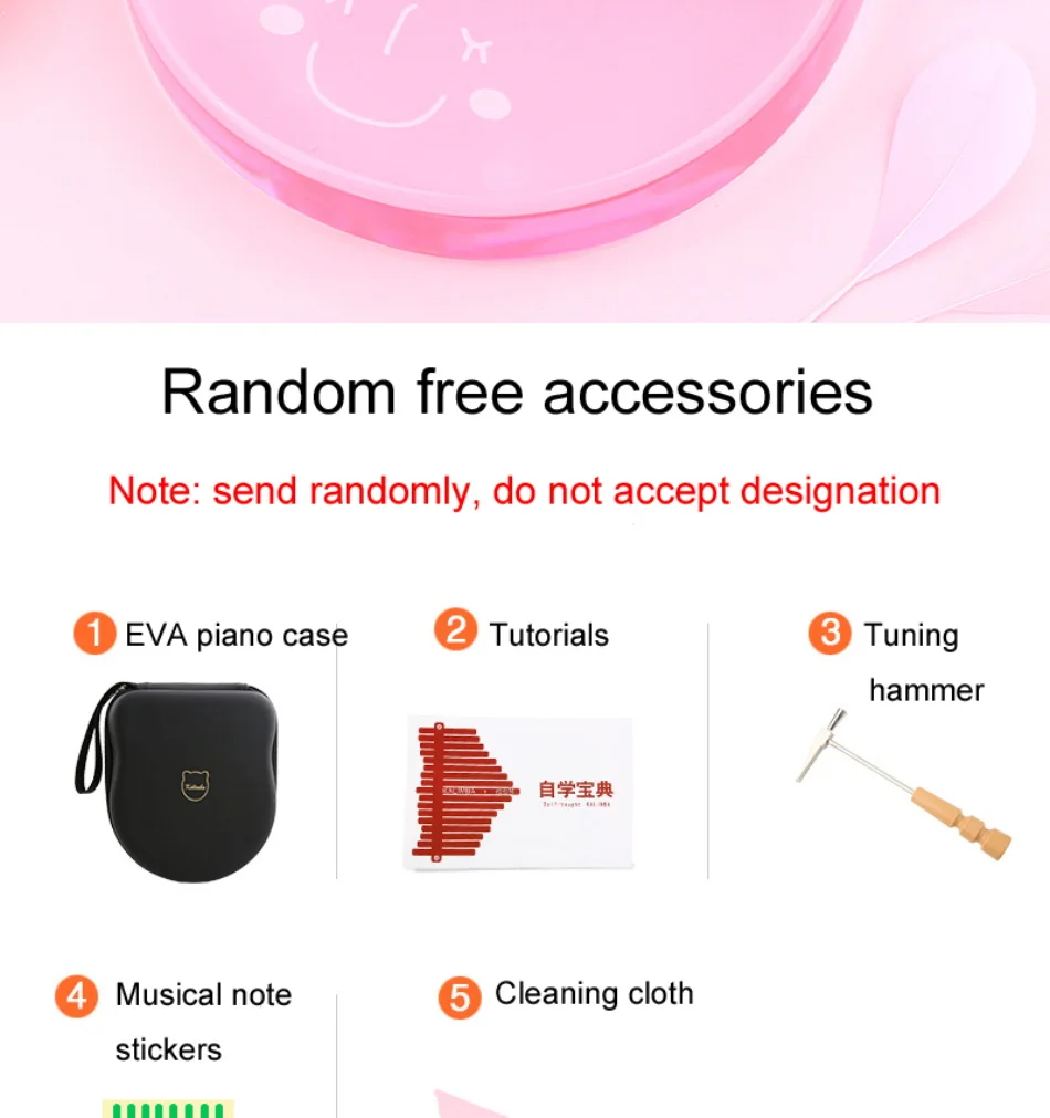 В комплекте поставляется чехол, удобно носить с собой и сделать замечательной музыкой в любом месте и наклейки для того, чтобы помочь вам узнать и играть калимба легко и быстро.