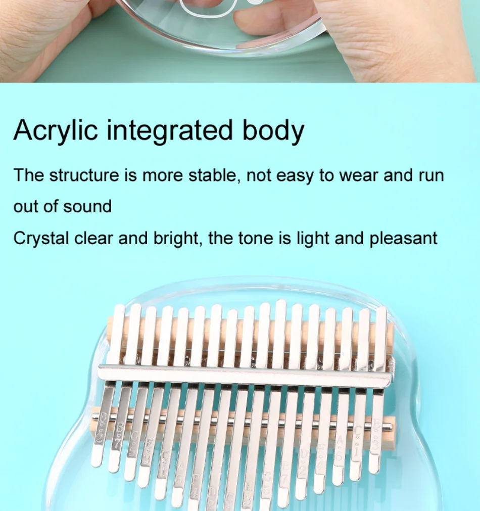 3. Эти прозрачные радужные калимбас очень легко научиться и играть, ключи выгравированы с нотами, более удобны, чем другие наклейки нот большого пальца пианино, вам просто нужно использовать два пальца или тюнинговый молоток, чтобы сделать отличный звук.
