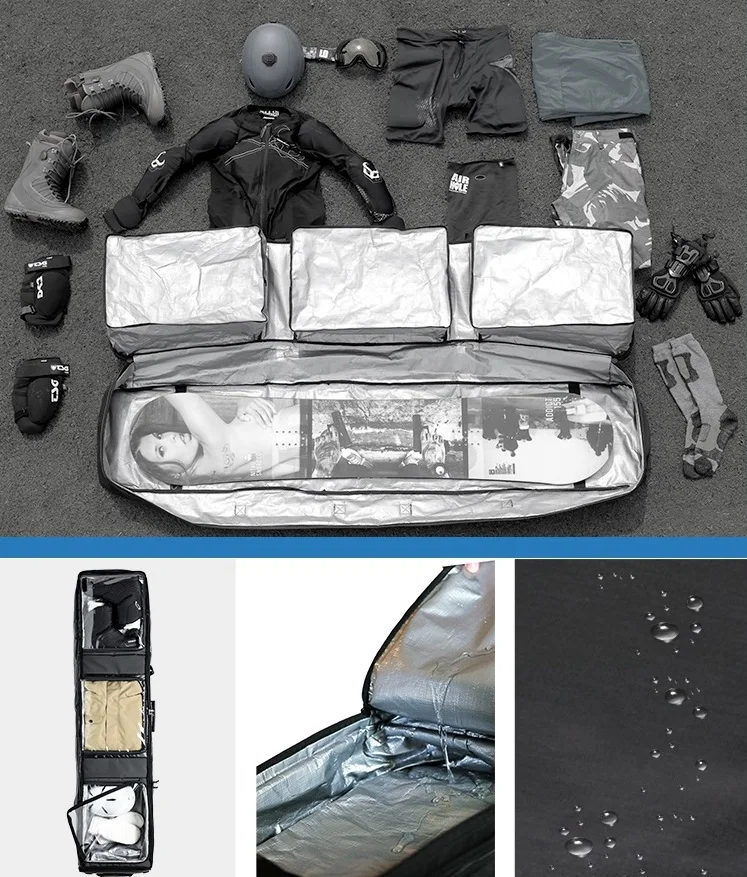 Благодаря тому, что чехол снабжен 3 просторными и организованными отделенными отсеками, в него помещаются весь комплект горнолыжного оборудования (лыжи-сноуборд, обувь, шлем, куртка, штаны, термобелье) и личные вещи, и не забываем о возможности перевеса багажа, уточняйте у туроператора.