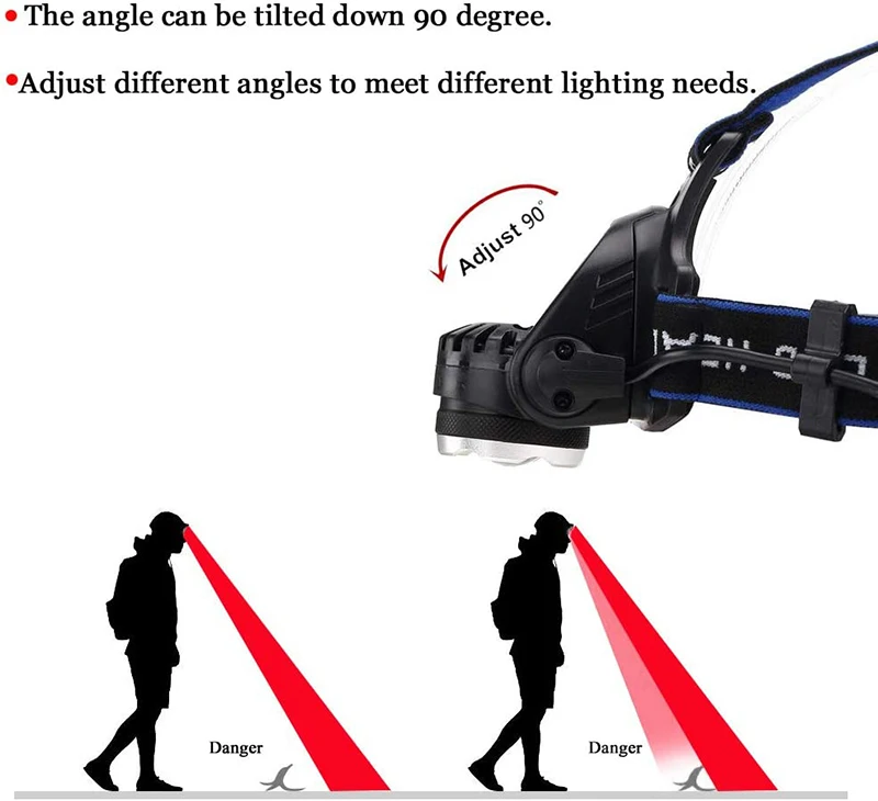 3 режима освещения: Этот налобный фонарь имеет регулируемую функцию яркости (Высокий/низкий/Стробоскоп). Если вы удерживаете кнопку, она будет проходить через различные режимы яркости, когда вам нужна другая яркость.