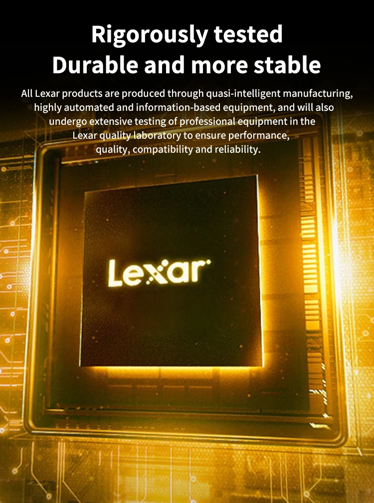 ● Вся продукция Lexar производится путем квазиинтеллектуального производства, высокоавтоматизированного и информационного оборудования и проходит обширное тестирование профессиональным оборудованием в лабораториях качества Lexar.