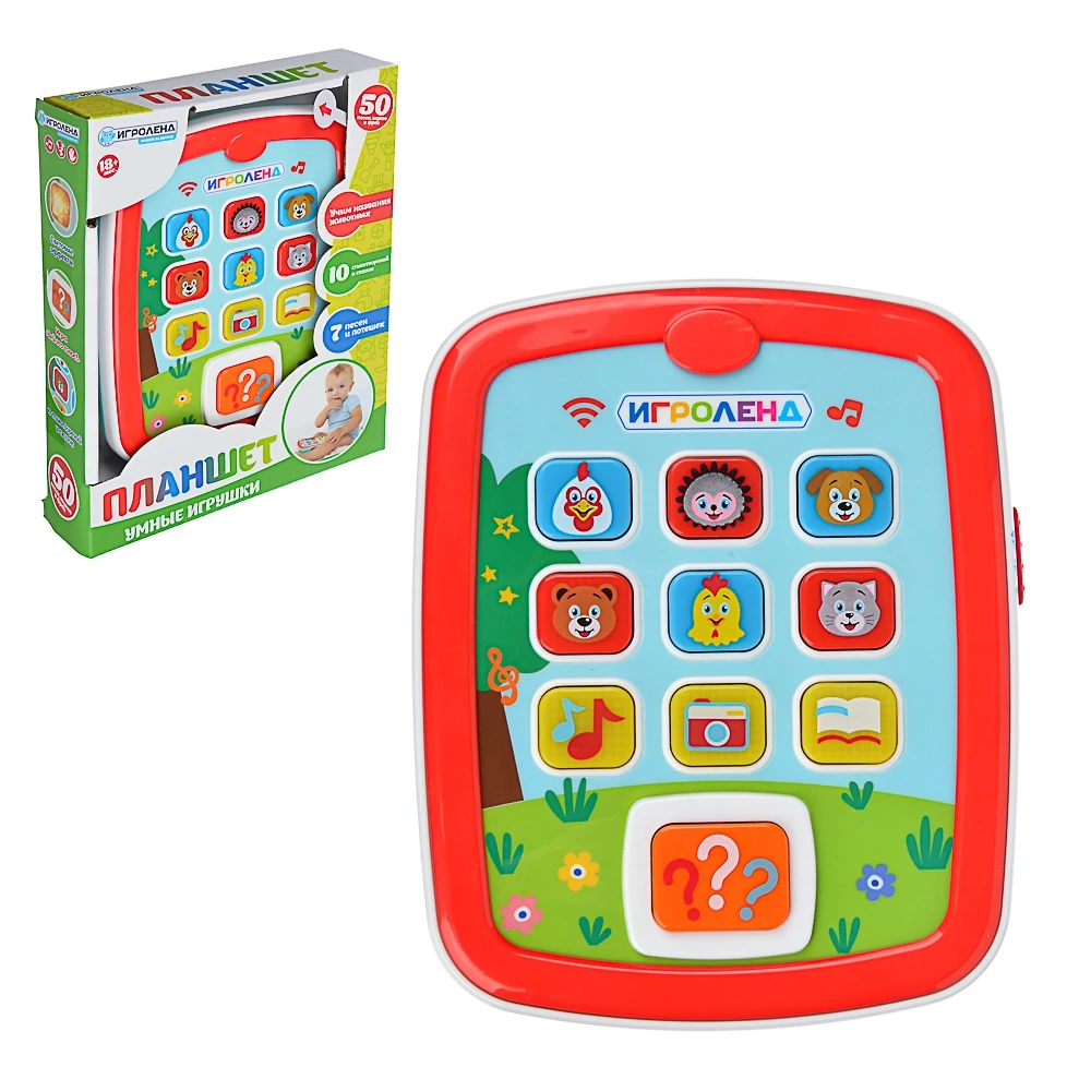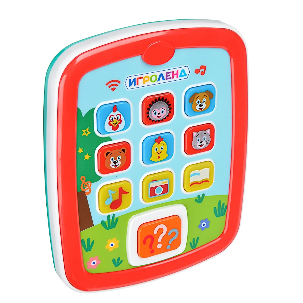 Планшет имеет яркую окраску, веселые звуки и яркую подсветку, что делает игрушку максимально реалистичной и адаптированной для использования ребенком.