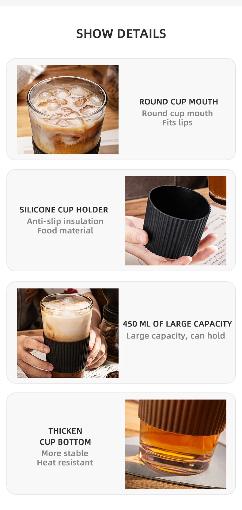 Бессвинцовый стеклянный материал, экологически чистый материал, здоровый и безопасный, прозрачный и яркий. Толстое жаростойкое стекло, с герметичной силиконовой крышкой, уплотнительное резиновое кольцо перевернуто вверх дном, чтобы предотвратить капель, и чашка может использоваться в качестве соломы или чашки для воды, что удобно и практично. Закругленный рот чашки, утолщенные и гладкие губы без РАН, безопасны для здоровья и окружающей среды и могут использоваться взрослыми и детьми.