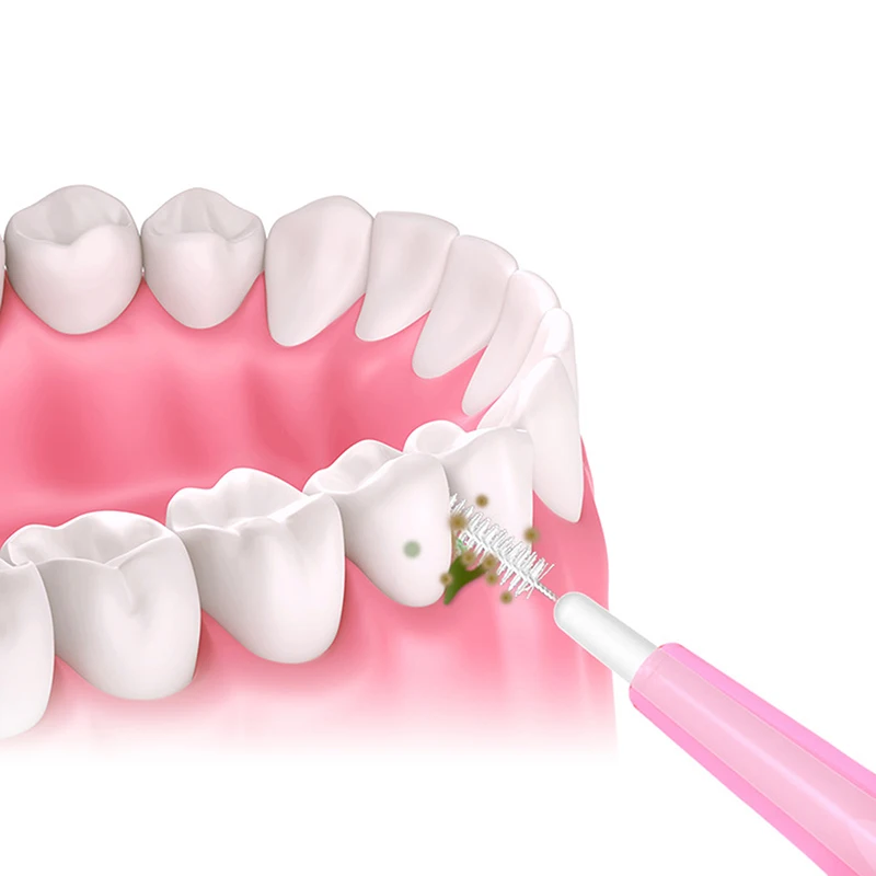 Поместите межзубную щетку на зубы и медленно перемещайте щетку назад и вперед на зубной щель, чтобы удалить остатки пищи между зубами.